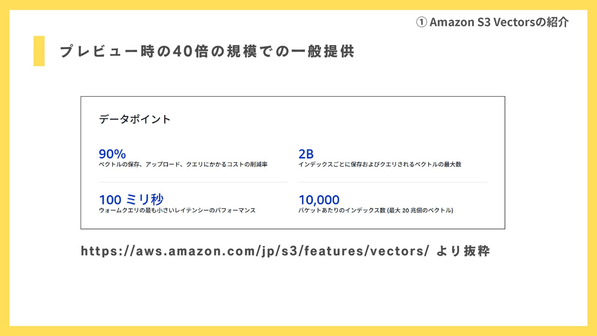 プレビュー時の40倍の規模での一般提供 ① Amazon S3 Vectorsの紹介 https://aws.amazon.com/jp/s3/features/vectors/ より抜粋