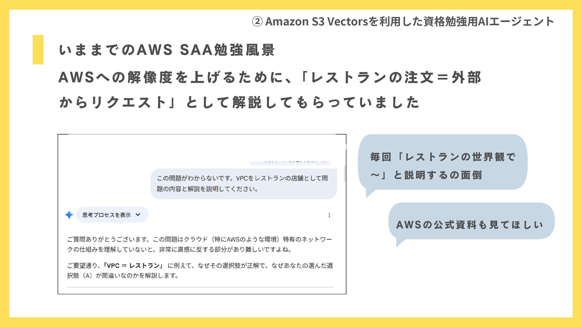 毎回「レストランの世界観で ~」と説明するの面倒 AWSの公式資料も見てほしい いままでのAWS SAA勉強風景 ② Amazon S3 Vectorsを利用した資格勉強用AIエージェント AWSへの解像度を上げるために、