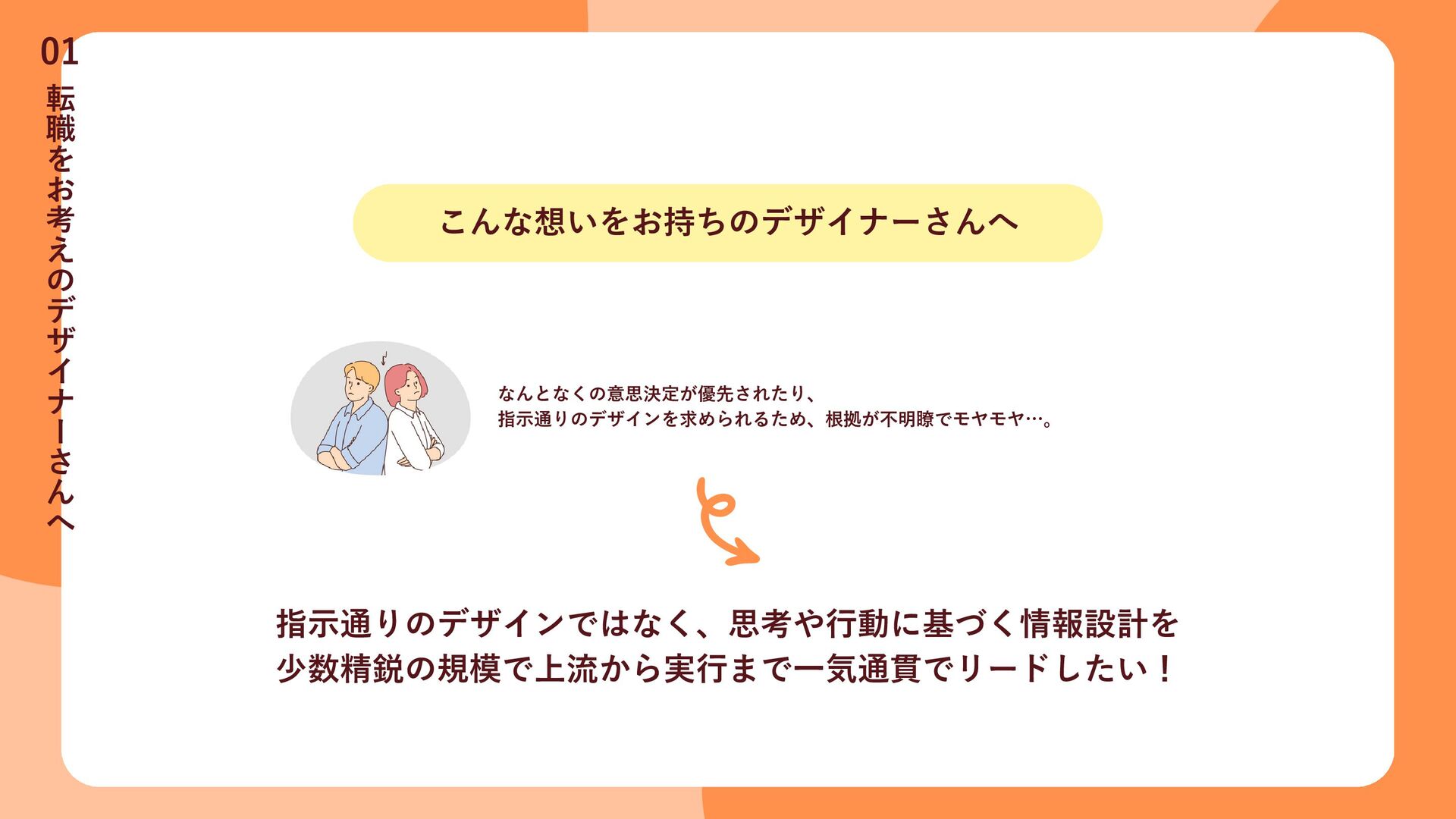 こんな想いをお持ちのデザイナーさんへ なんとなくの意思決定が優先されたり、 指示通りのデザインを求められるため、根拠が不明瞭でモヤモヤ…。 指示通りのデザインではなく、思考や行動に基づく情報設計を 少数精鋭の規模で上流から実行まで一気通貫でリードしたい! 転 職 を お 考