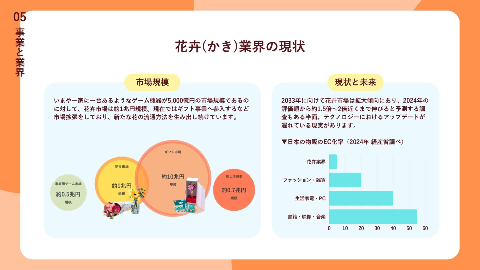 市場規模 現状と未来 いまや一家に一台あるようなゲーム機器が5,000億円の市場規模であるの に対して、花卉市場は約1兆円規模。現在ではギフト事業へ参入するなど 市場拡張をしており、新たな花の流通方法を生み出し続けています。 2033年に向けて花卉市場は拡大傾向にあり、2024年の 評価額から約1.5倍〜2倍近くまで伸びると予測する調 査もある半面、テクノロジーにおけるアップデートが 遅れている現実があります。 ▼日本の物販のEC化率(2024年