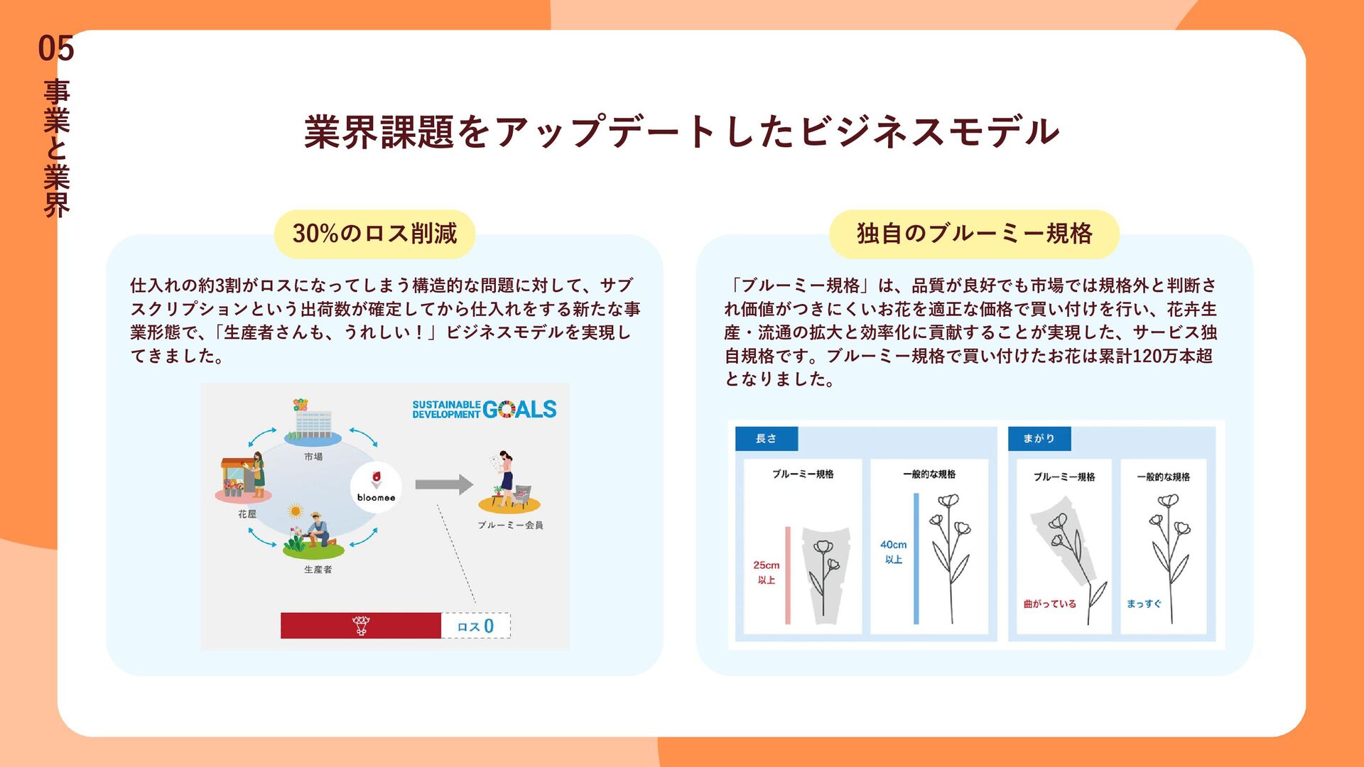 自規格です。ブルーミー規格で買い付けたお花は累計120万本超 となりました。 業界課題をアップデートしたビジネスモデル 事 業 と 業 界 05