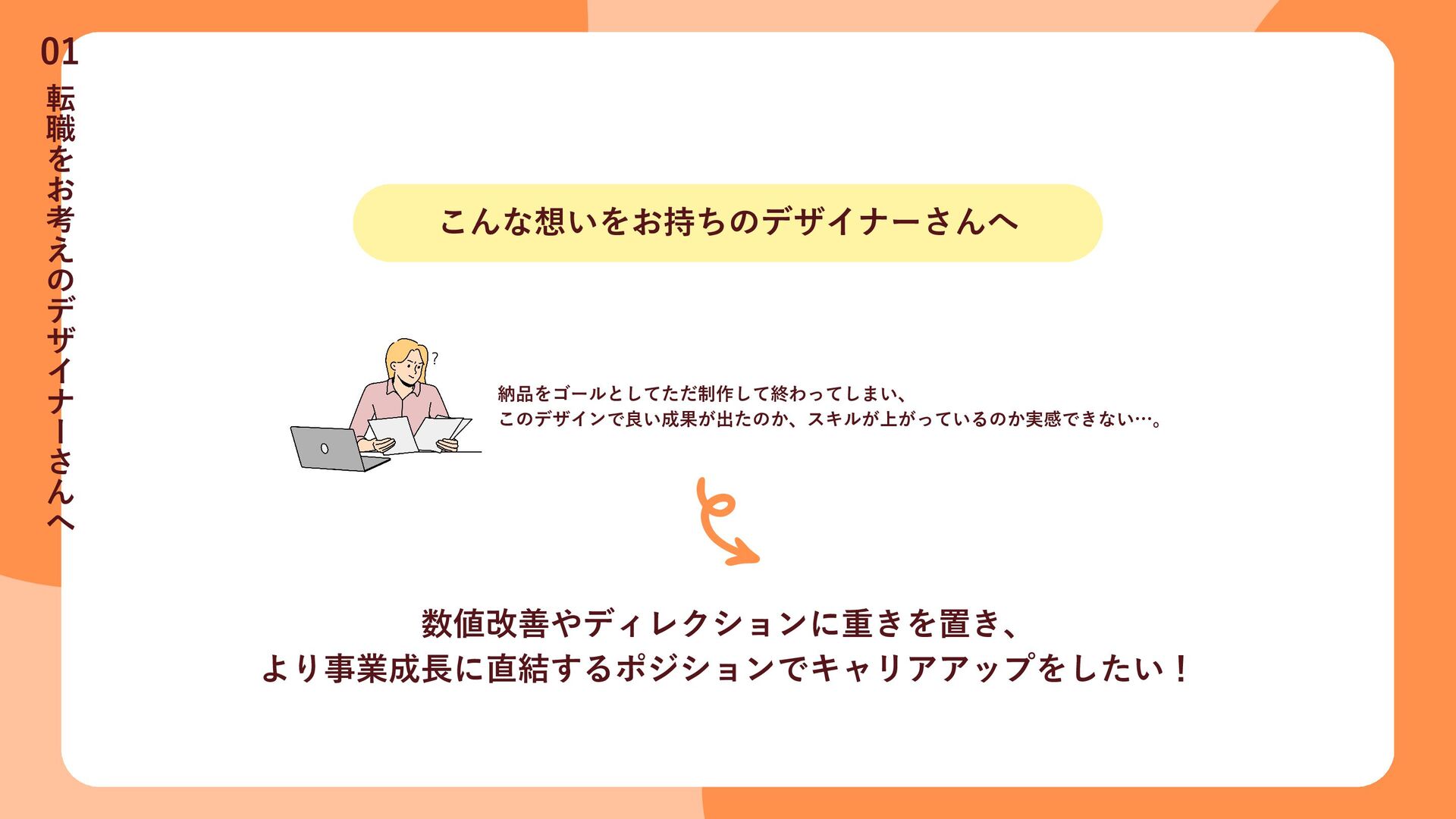 こんな想いをお持ちのデザイナーさんへ 納品をゴールとしてただ制作して終わってしまい、 このデザインで良い成果が出たのか、スキルが上がっているのか実感できない…。 数値改善やディレクションに重きを置き、 より事業成長に直結するポジションでキャリアアップをしたい! 転 職 を お 考