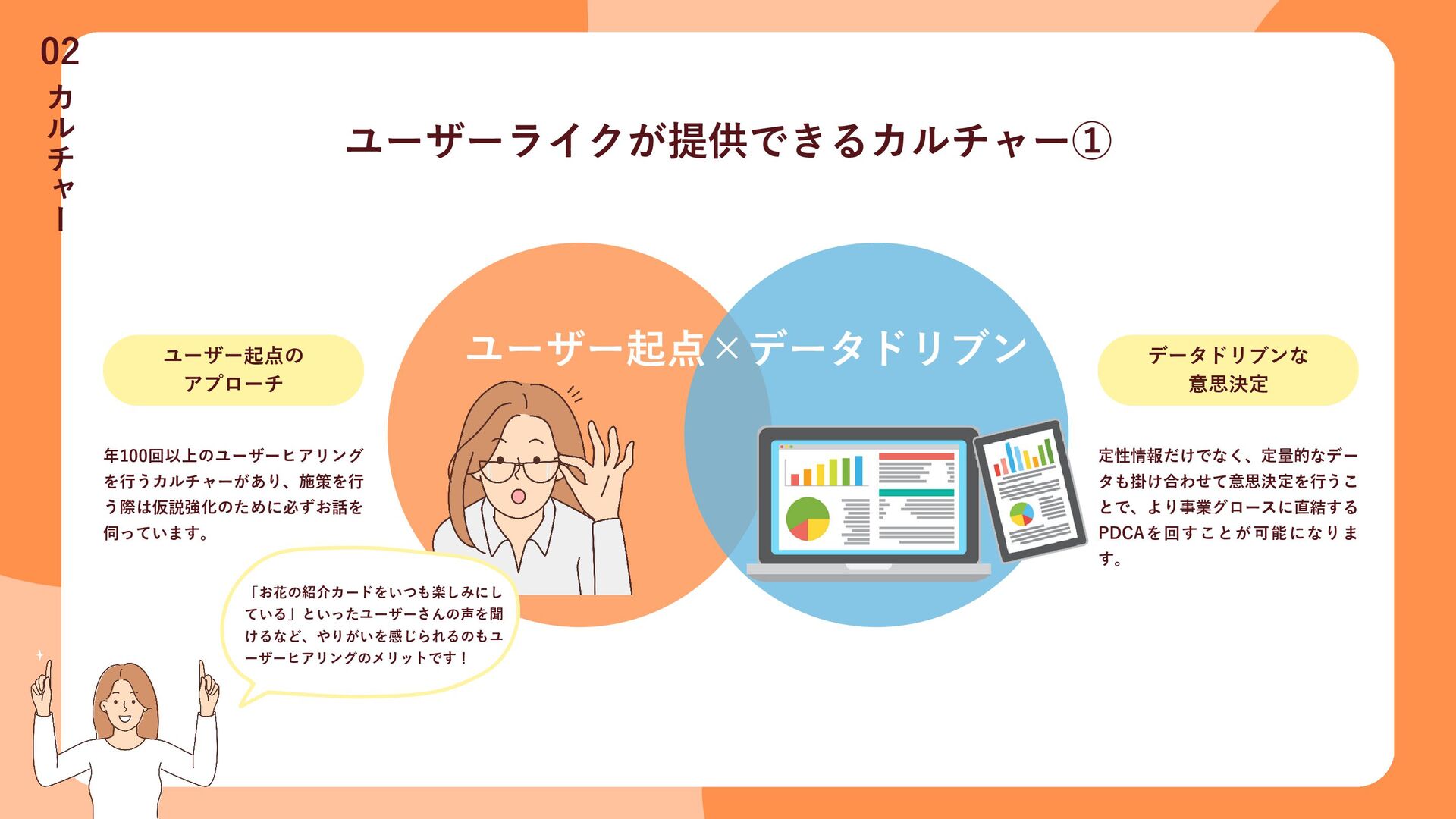 す。 データドリブンな 意思決定 ユーザー起点×データドリブン 「お花の紹介カードをいつも楽しみにし ている」といったユーザーさんの声を聞 けるなど、やりがいを感じられるのもユ ーザーヒアリングのメリットです! ユーザーライクが提供できるカルチャー① カ ル チ ャ ー 02