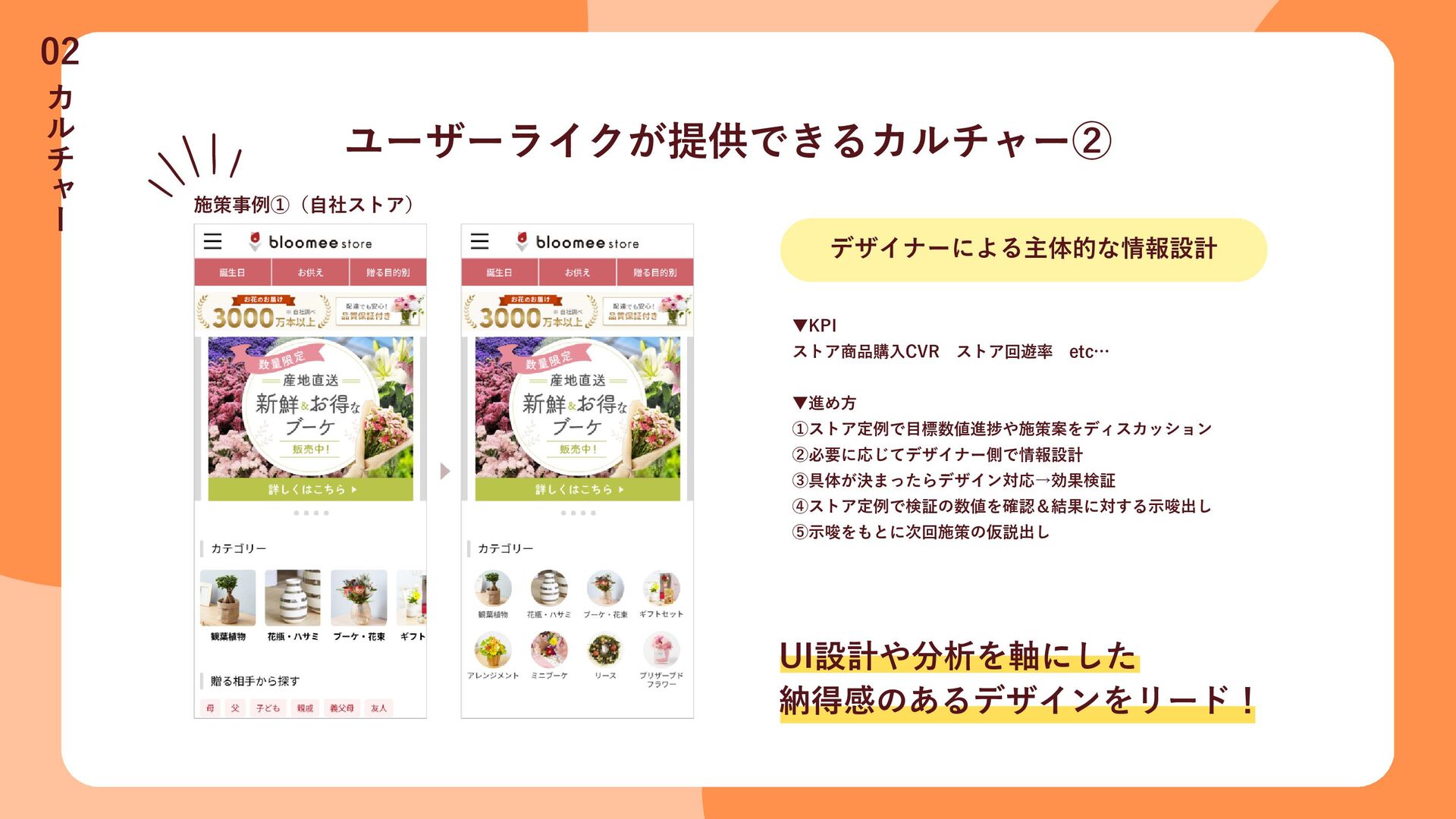 納得感のあるデザインをリード! 施策事例①(自社ストア) ユーザーライクが提供できるカルチャー② カ ル チ ャ ー 02