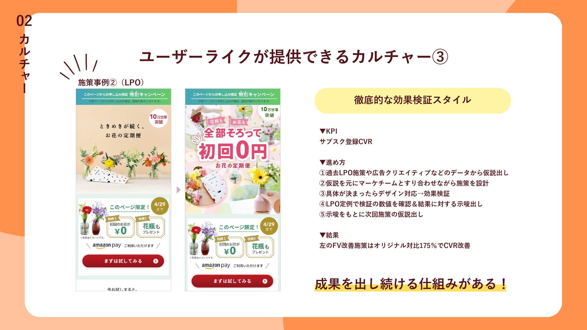 徹底的な効果検証スタイル 成果を出し続ける仕組みがある! ユーザーライクが提供できるカルチャー③ 施策事例②(LPO) カ ル チ ャ ー 02