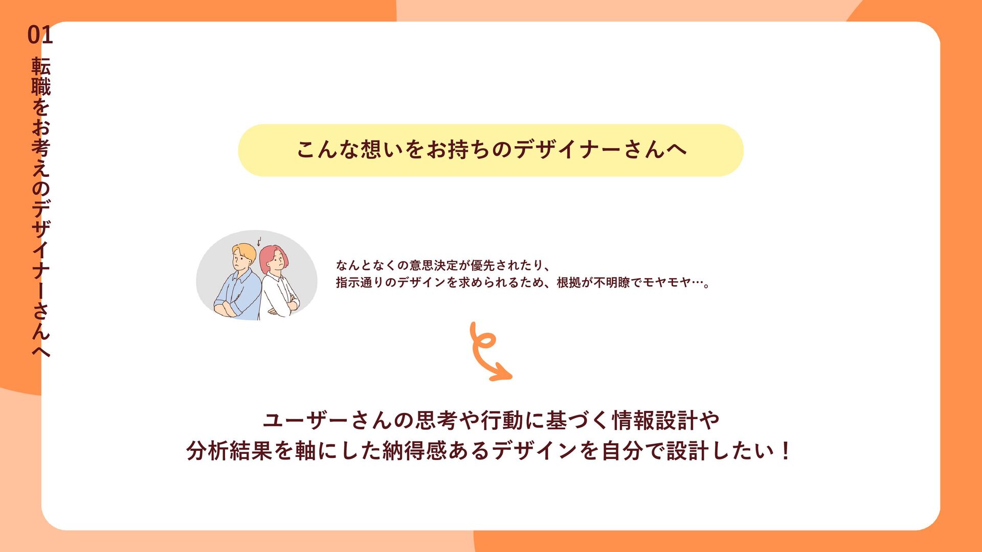 こんな想いをお持ちのデザイナーさんへ なんとなくの意思決定が優先されたり、 指示通りのデザインを求められるため、根拠が不明瞭でモヤモヤ…。 ユーザーさんの思考や行動に基づく情報設計や 分析結果を軸にした納得感あるデザインを自分で設計したい! 転 職 を お 考
