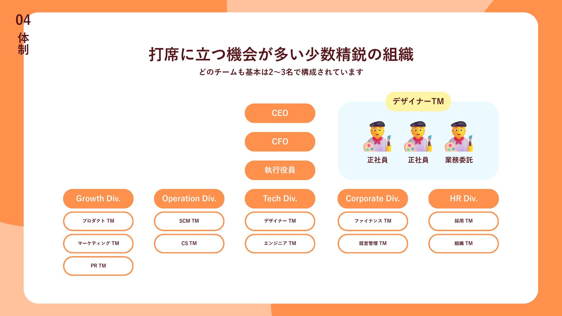 ファイナンス TM 採用 TM 組織 TM 経営管理 TM エンジニア TM CS TM マーケティング TM PR TM Tech Div. Operation Div. Corporate Div. HR Div. 執行役員 CFO CEO デザイナーTM 正社員 業務委託 正社員 体 制 04