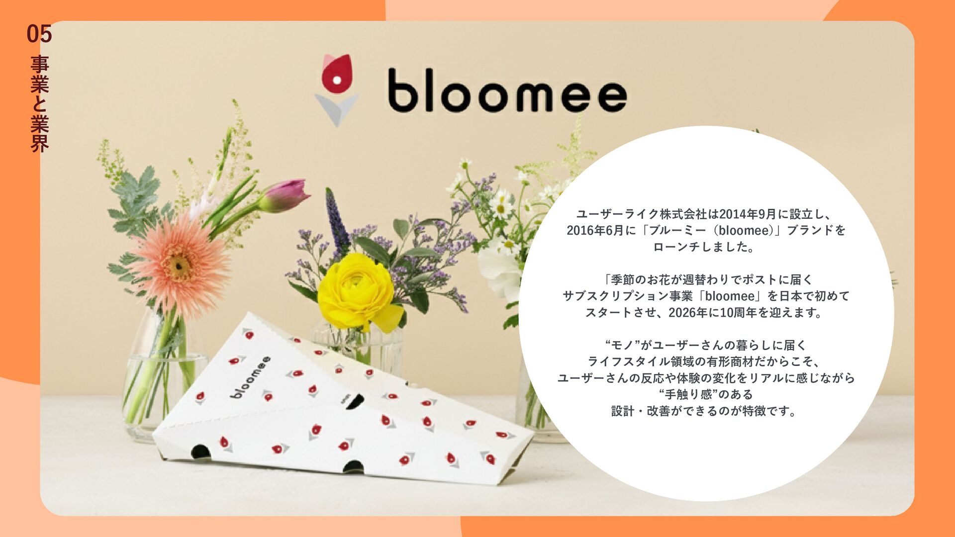 ユーザーライク株式会社は2014年9月に設立し、 2016年6月に「ブルーミー(bloomee) 」ブランドを ローンチしました。 「季節のお花が週替わりでポストに届く サブスクリプション事業「bloomee」を日本で初めて スタートさせ、2026年に10周年を迎えます。 “モノ”がユーザーさんの暮らしに届く ライフスタイル領域の有形商材だからこそ、 ユーザーさんの反応や体験の変化をリアルに感じながら