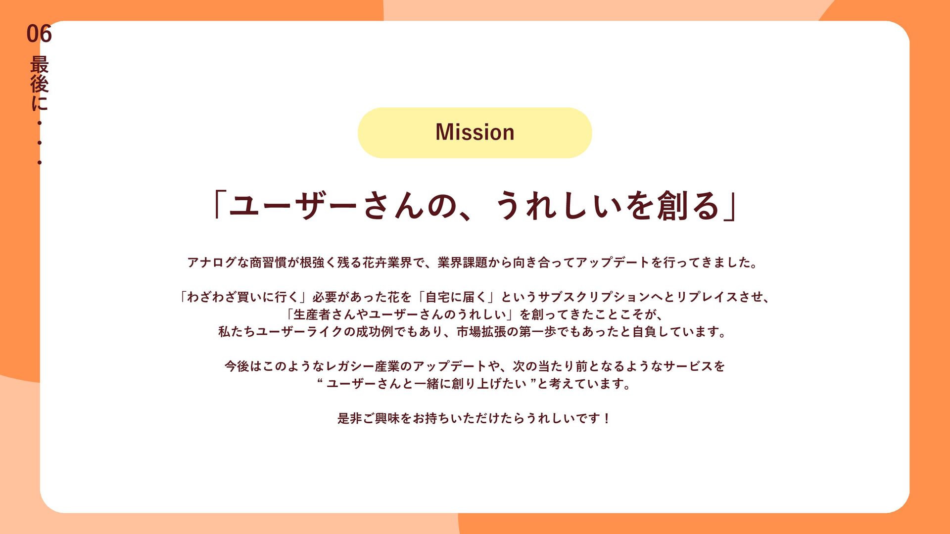 最 後 に ・ ・ ・ 06 「ユーザーさんの、うれしいを創る」 アナログな商習慣が根強く残る花卉業界で、業界課題から向き合ってアップデートを行ってきました。 「わざわざ買いに行く」必要があった花を「自宅に届く」というサブスクリプションへとリプレイスさせ、