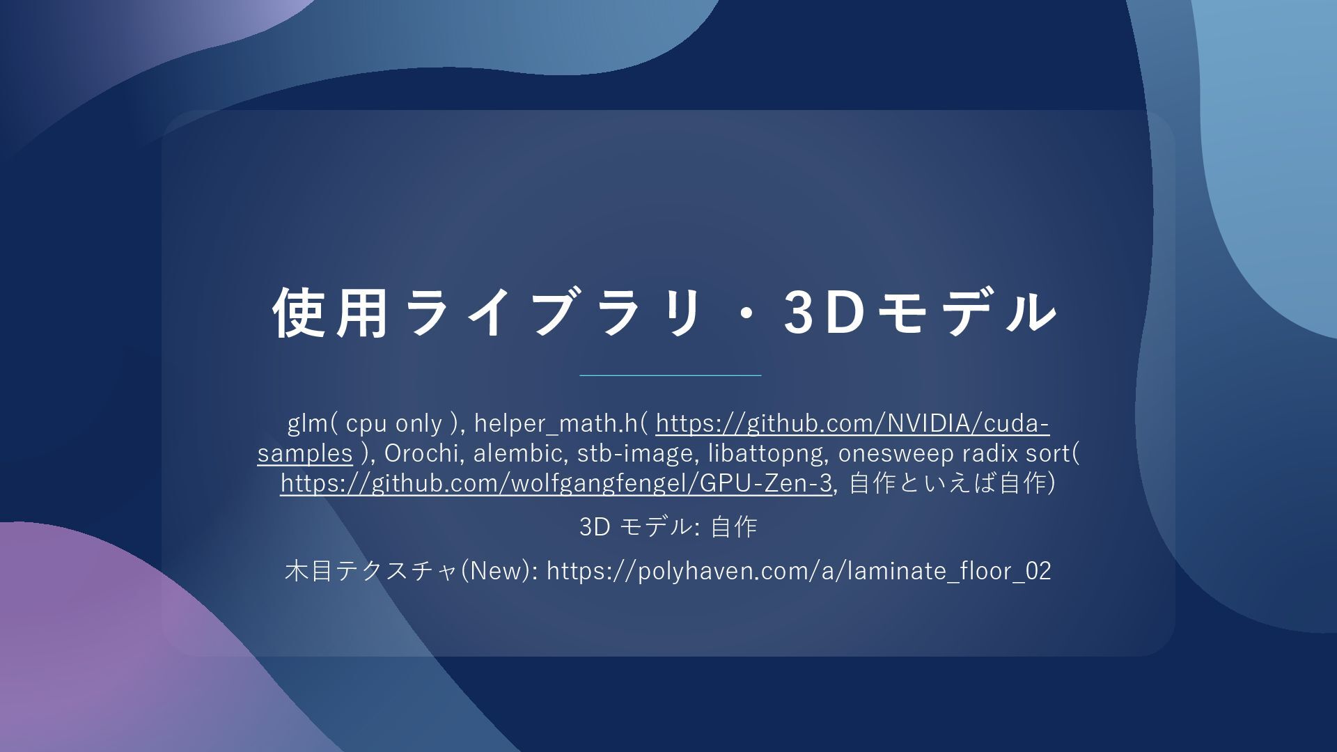 デ ル glm( cpu only ), helper_math.h( https://github.com/NVIDIA/cuda- samples ), Orochi, alembic, stb-image, libattopng, onesweep radix sort( https://github.com/wolfgangfengel/GPU-Zen-3, 自作といえば自作) 3D モデル: 自作 木目テクスチャ(New): https://polyhaven.com/a/laminate_floor_02