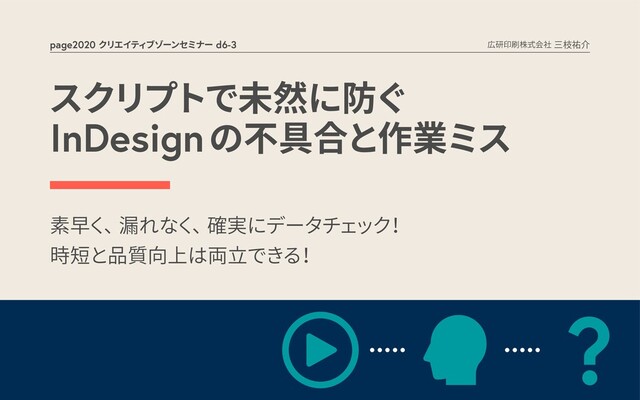 page2020 クリエイティブゾーンセミナー d6-3 広研印刷株式会社 三枝祐介 スクリプトで未然に防ぐ InDesignの不具合と作業ミス 素早く、 漏れなく、 確実にデータチェック