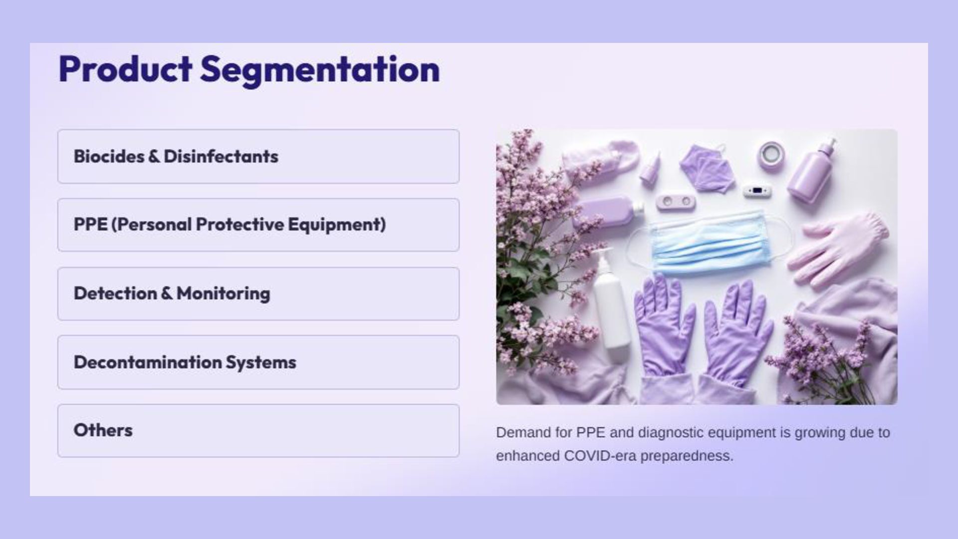 Technological advancements are supporting the growth of this market. Innovations such as biosensors, smart monitoring systems, and automated decontamination units are improving real-time detection and containment of threats. Additionally, global health agencies like the World Health Organization (WHO) are enforcing strict guidelines that influence purchasing decisions and compliance in critical sectors, further supporting market growth.