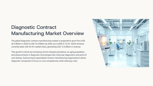 The Global Diagnostic Contract Manufacturing Market was valued at USD 28.5 billion in 2024. It is projected to reach approximately USD 76.0 billion by 2034. This growth reflects a strong compound annual growth rate (CAGR) of 10.3% during the forecast period from 2025 to 2034. The rising demand for cost-effective diagnostic solutions is a major driver. Increasing outsourcing by diagnostic companies to reduce manufacturing costs is also contributing to market expansion. Additionally, advancements in medical technology are fueling this upward trend.