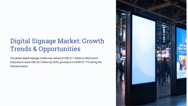 displays, direct-view LED walls, 8K QLED displays, UHD 4K displays, outdoor signage, and interactive touch displays. LG Electronics Provides video walls, standard signage, ultra HD large displays, and indoor/outdoor LED signage solutions. Sony Corporation Introduced professional 4K HDR BRAVIA displays in 2021 with BZ35J and BZ30J series for high-end and mid- range business markets. Other key players include Daktronics, Panasonic Corporation, NEC Corporation, Leyard Optoelectronic Co., Ltd., Scala, E Ink Holdings Inc., and Omnivex Corporation.
