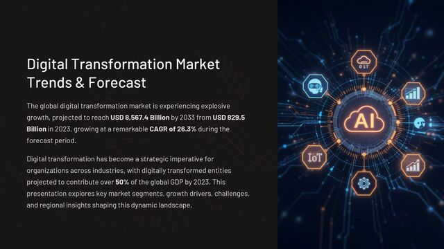 The global digital transformation market is witnessing remarkable growth, expected to reach USD 8,567.4 billion by 2033, expanding at a strong CAGR of 26.3% from 2024 to 2033. This surge is fueled by the widespread integration of AI, cloud computing, and IoT, which streamline operations, cut costs, and enhance productivity.