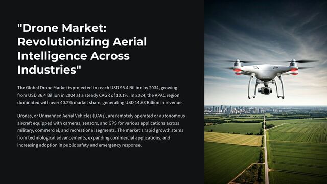 The Global Drone Market is projected to reach a value of USD 95.4 Billion by 2034, up from USD 36.4 Billion in 2024, expanding at a compound annual growth rate (CAGR) of 10.1% between 2025 and 2034. This growth is being driven by increasing demand for drones across various sectors including agriculture, logistics, infrastructure, and defense, supported by advancements in AI-based navigation and regulatory relaxation in several countries.