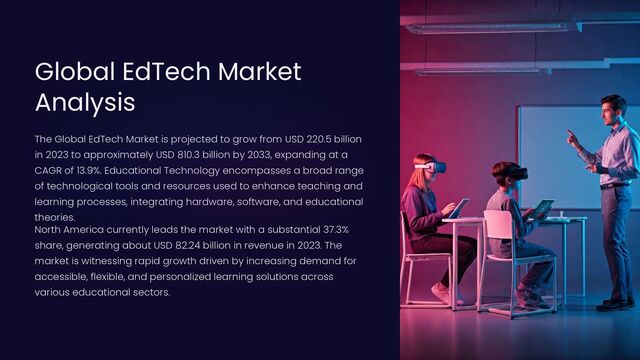 The global EdTech market is experiencing rapid expansion, projected to grow from USD 220.5 billion in 2023 to approximately USD 810.3 billion by 2033, registering a strong CAGR of 13.9% over the forecast period from 2024 to 2033.