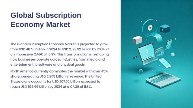 The global subscription economy market is undergoing rapid transformation, projected to grow from USD 487.0 billion in 2024 to approximately USD 2,129.92 billion by 2034, advancing at a strong CAGR of 15.9%. This growth reflects a shift in consumer behavior toward access-over-ownership models across multiple sectors. In 2024, North America led the global market, accounting for over 45% share and generating around USD 219.15 billion in revenue. The United States alone contributed USD 207.70 billion, which is forecast to grow to nearly USD 633.66 billion by 2034, expanding at a steady CAGR of 11.8%.