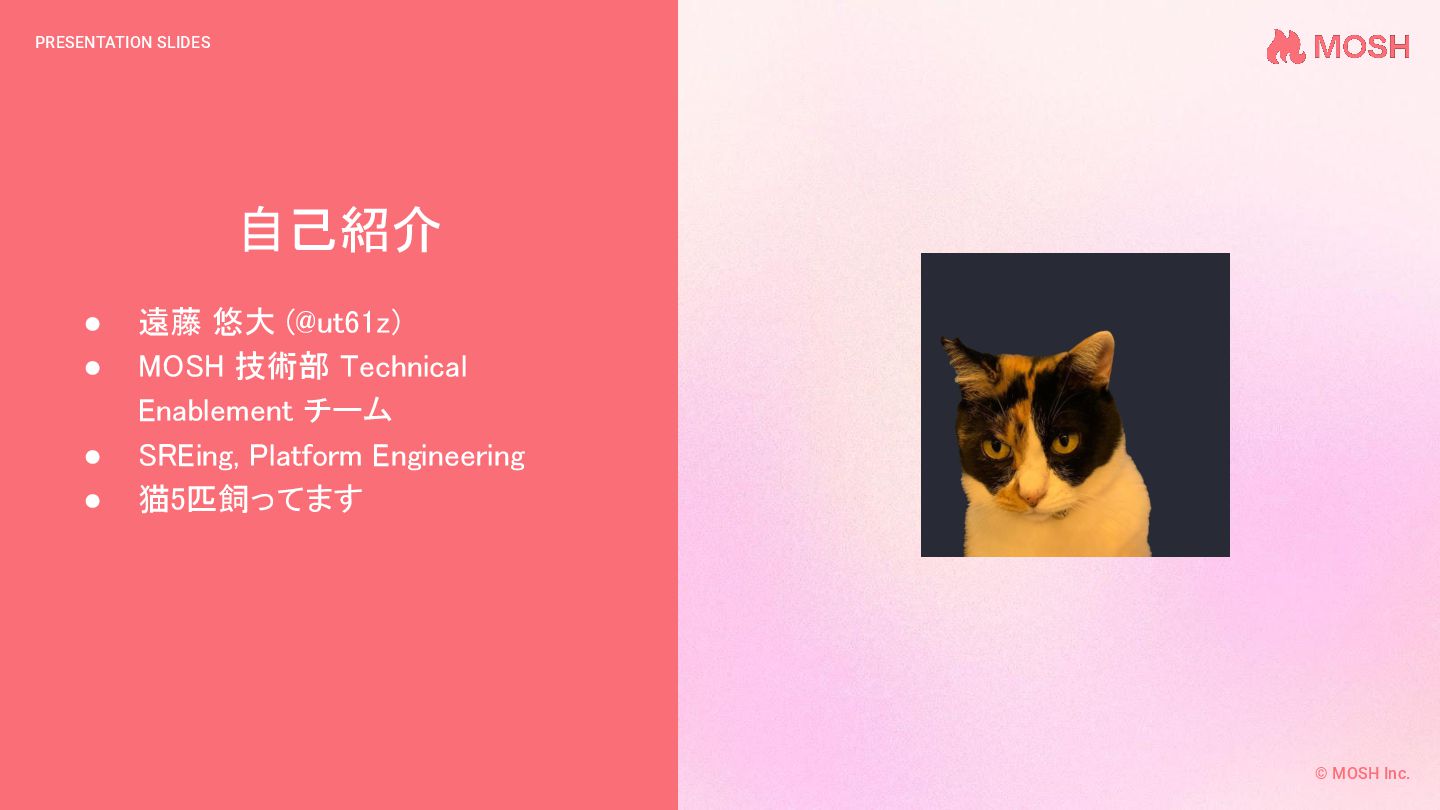 • MOSH 技術部 Technical Enablement チーム • SREing, Platform Engineering • 猫5匹飼ってます