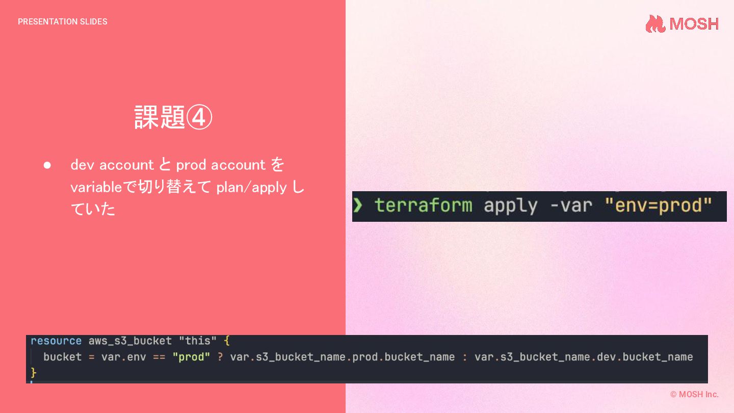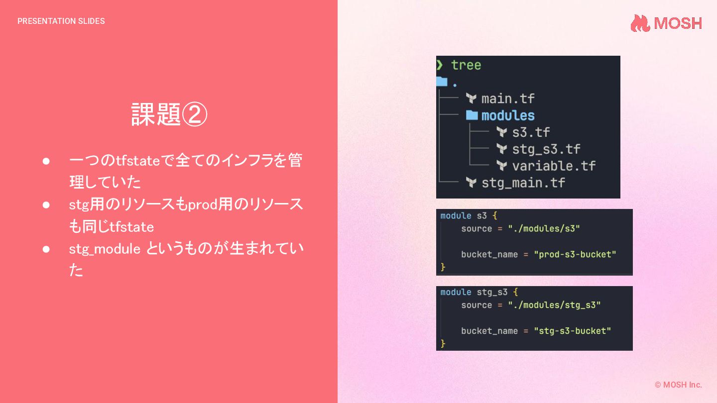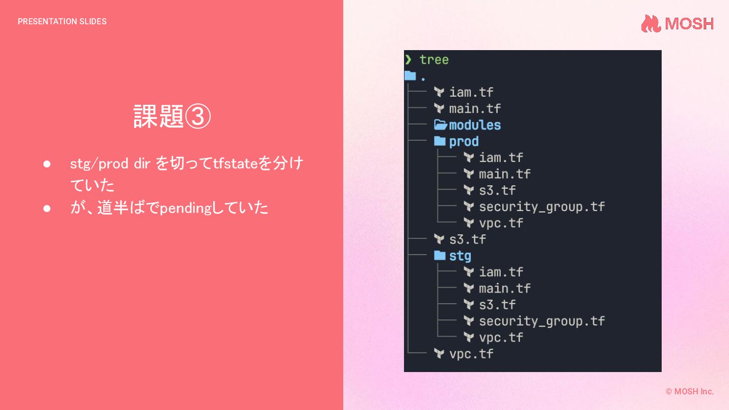 PRESENTATION SLIDES © MOSH Inc. 課題③ • stg/prod dir を切ってtfstateを分け