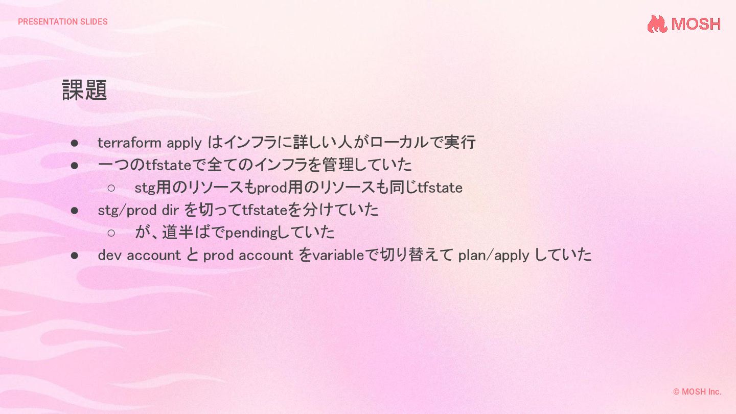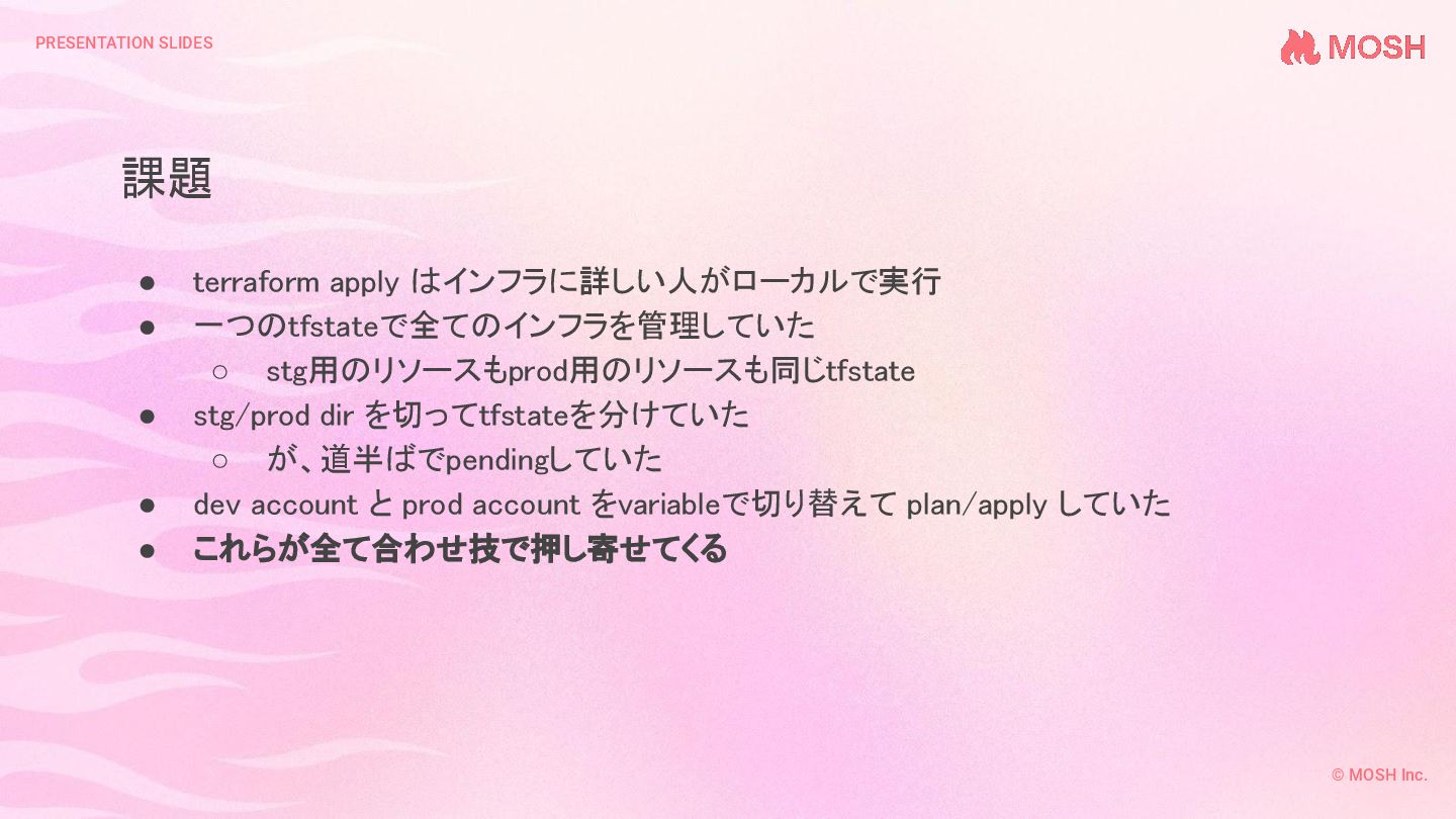 PRESENTATION SLIDES © MOSH Inc. 課題② • 一つのtfstateで全てのインフラを管 理していた •