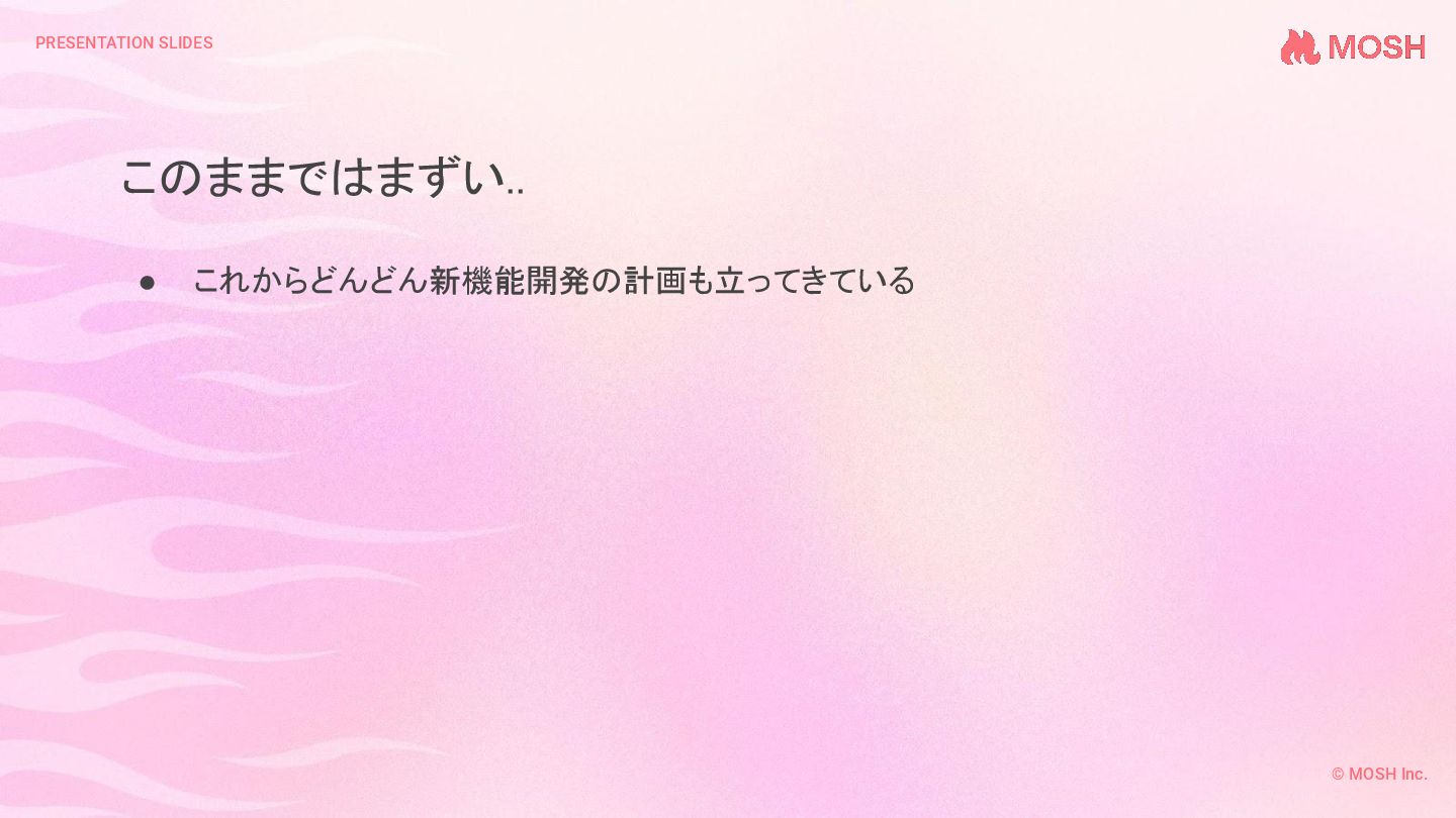 PRESENTATION SLIDES © MOSH Inc. このままではまずい.. • これからどんどん新機能開発の計画も立ってきている
