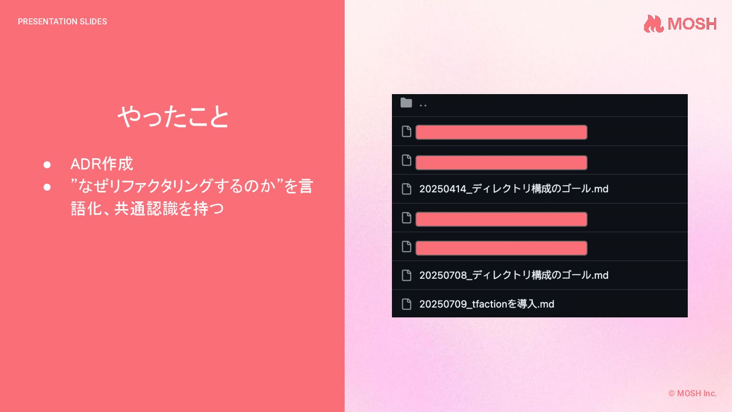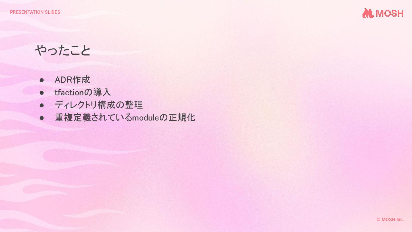 PRESENTATION SLIDES © MOSH Inc. やったこと • ADR作成 • tfactionの導入