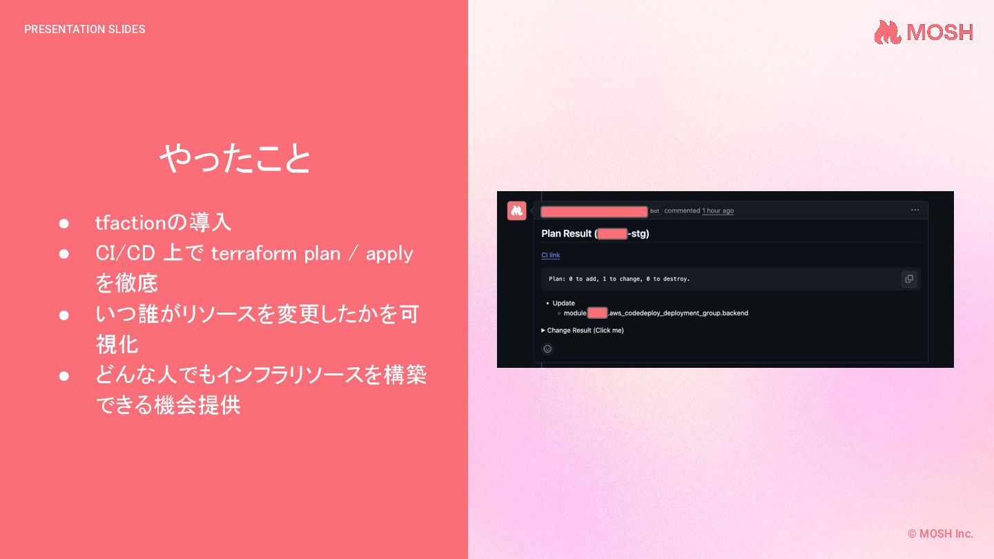 PRESENTATION SLIDES © MOSH Inc. やったこと • tfactionの導入 • CI/CD
