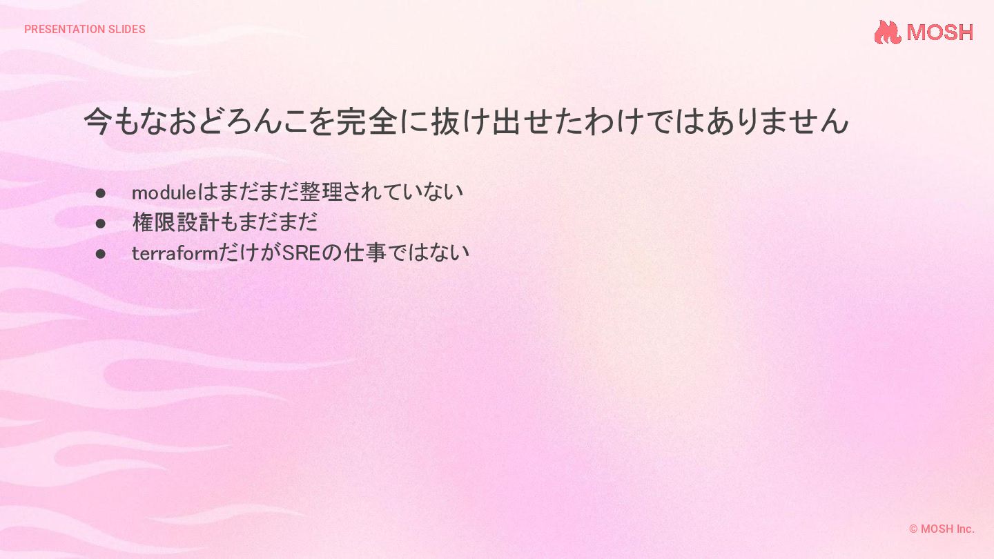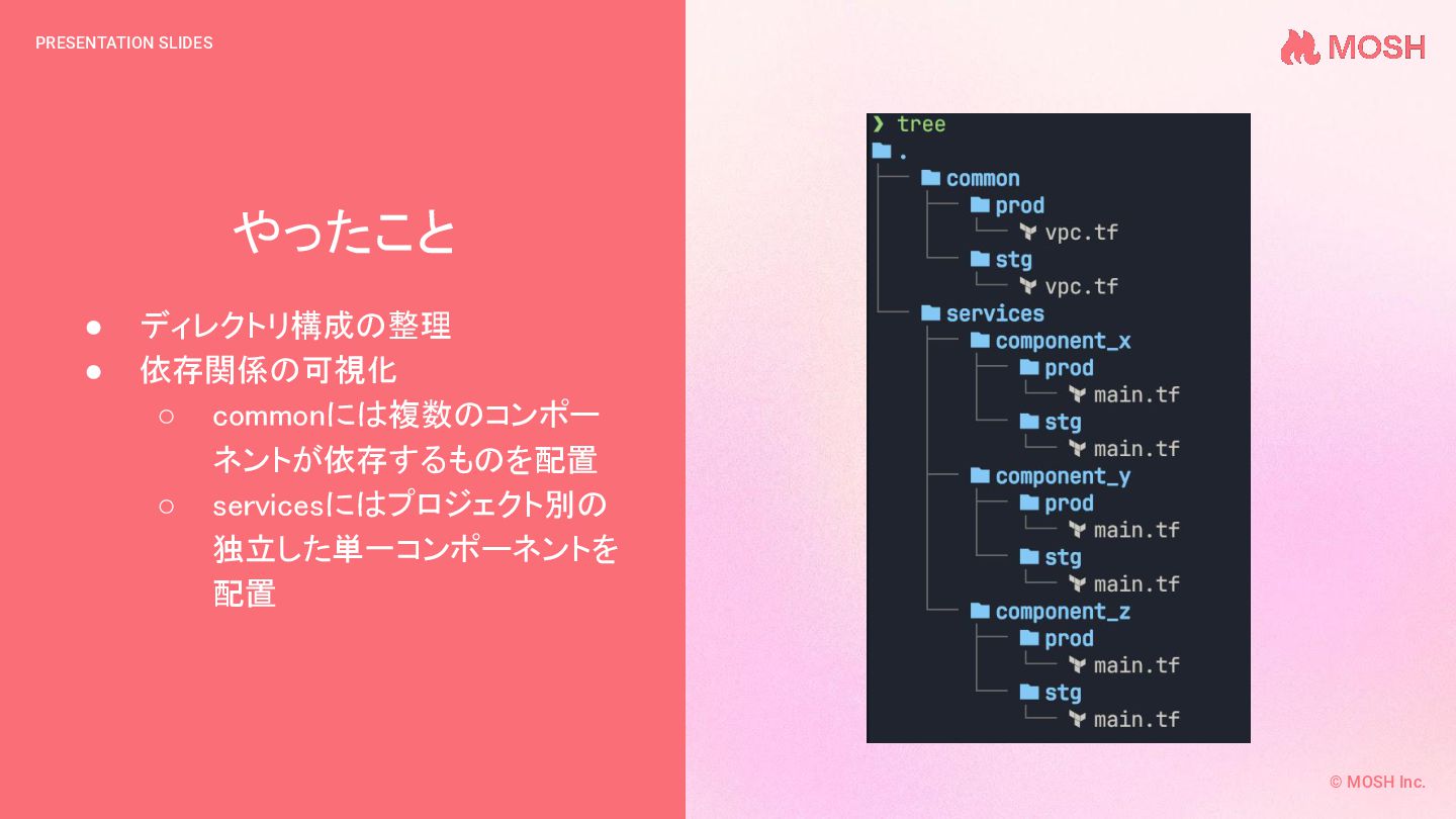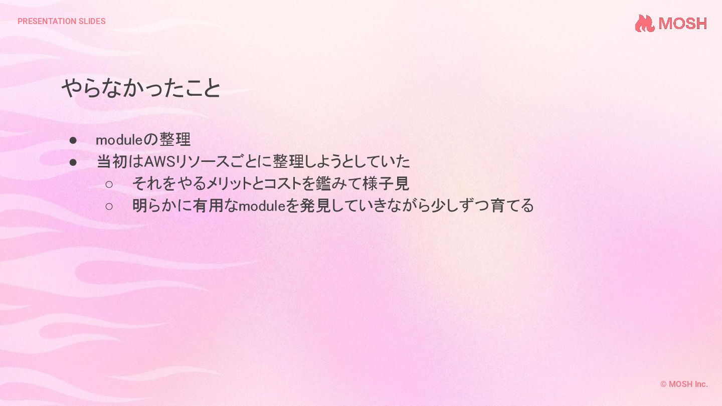 PRESENTATION SLIDES © MOSH Inc. やらなかったこと • moduleの整理 • 当初はAWSリソースごとに整理しようとしていた