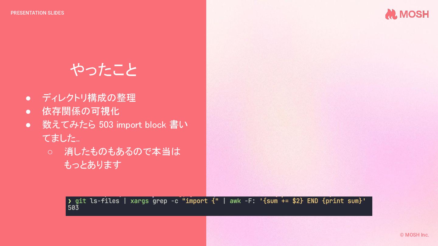 PRESENTATION SLIDES © MOSH Inc. やったこと • ディレクトリ構成の整理 • 依存関係の可視化