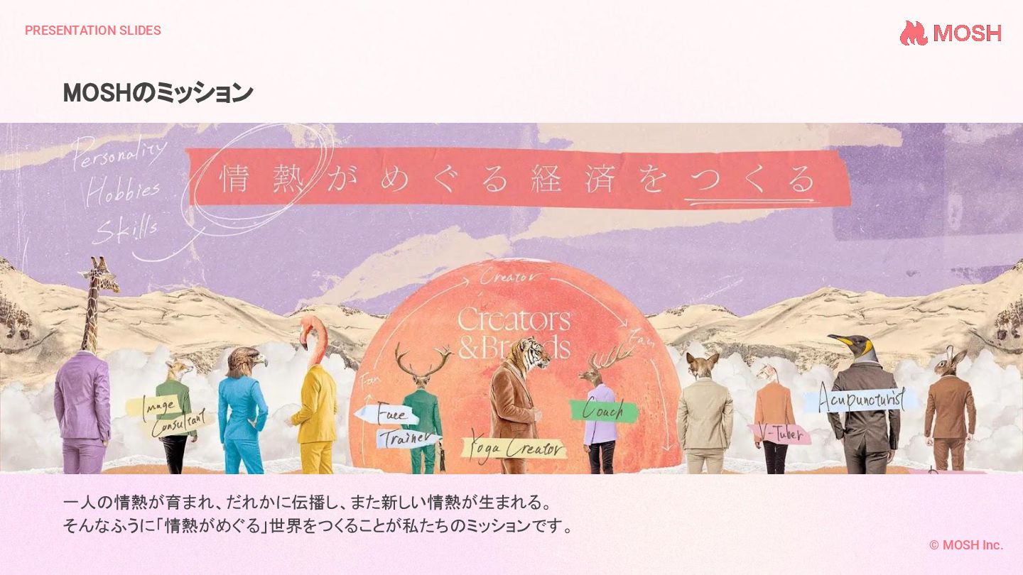そんなふうに「情熱がめぐる」世界をつくることが私たちのミッションです。 PRESENTATION SLIDES © MOSH Inc.
