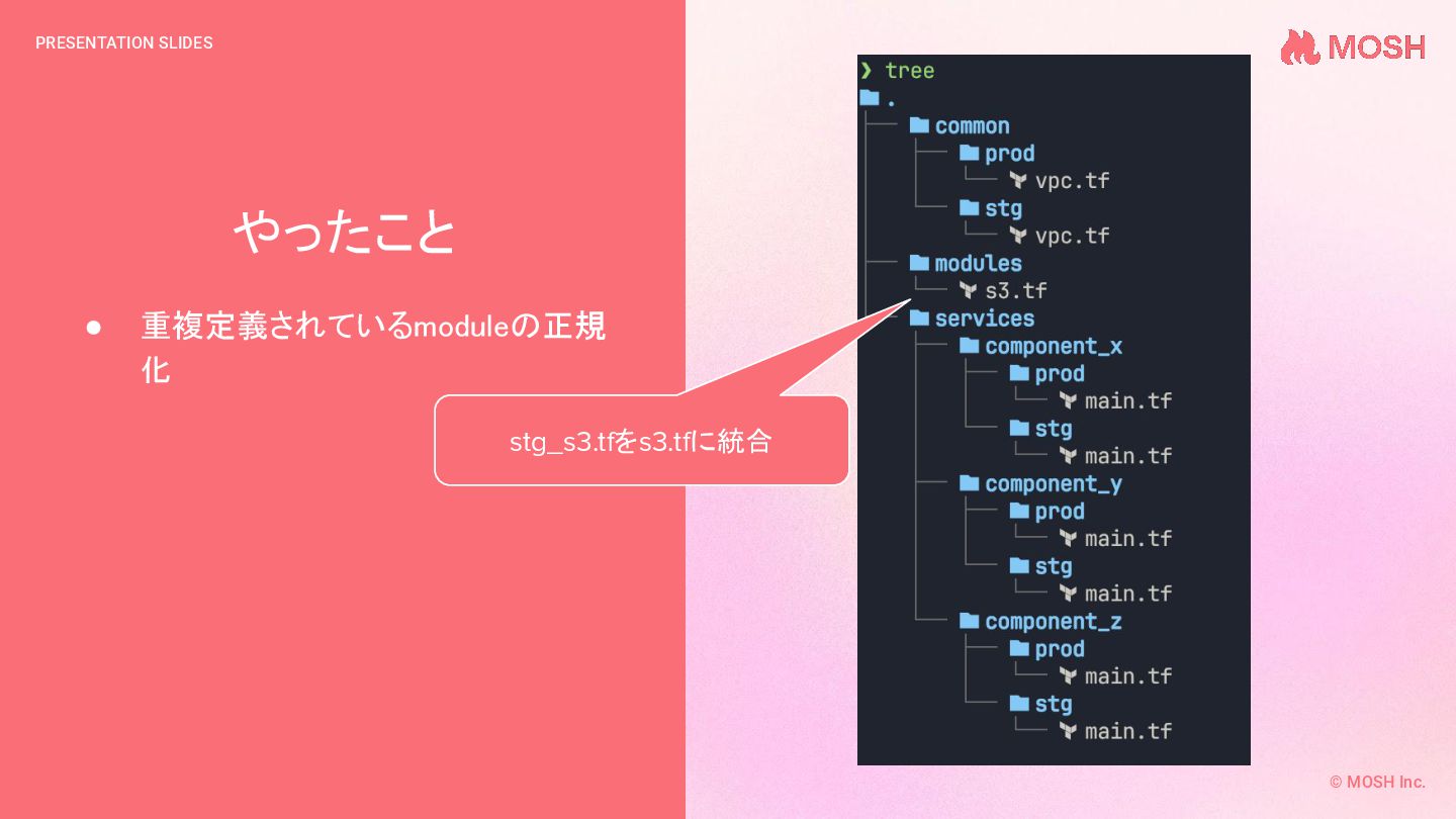 PRESENTATION SLIDES © MOSH Inc. やったこと • 重複定義されているmoduleの正規 化 stg_s3.tfをs3.tfに統合