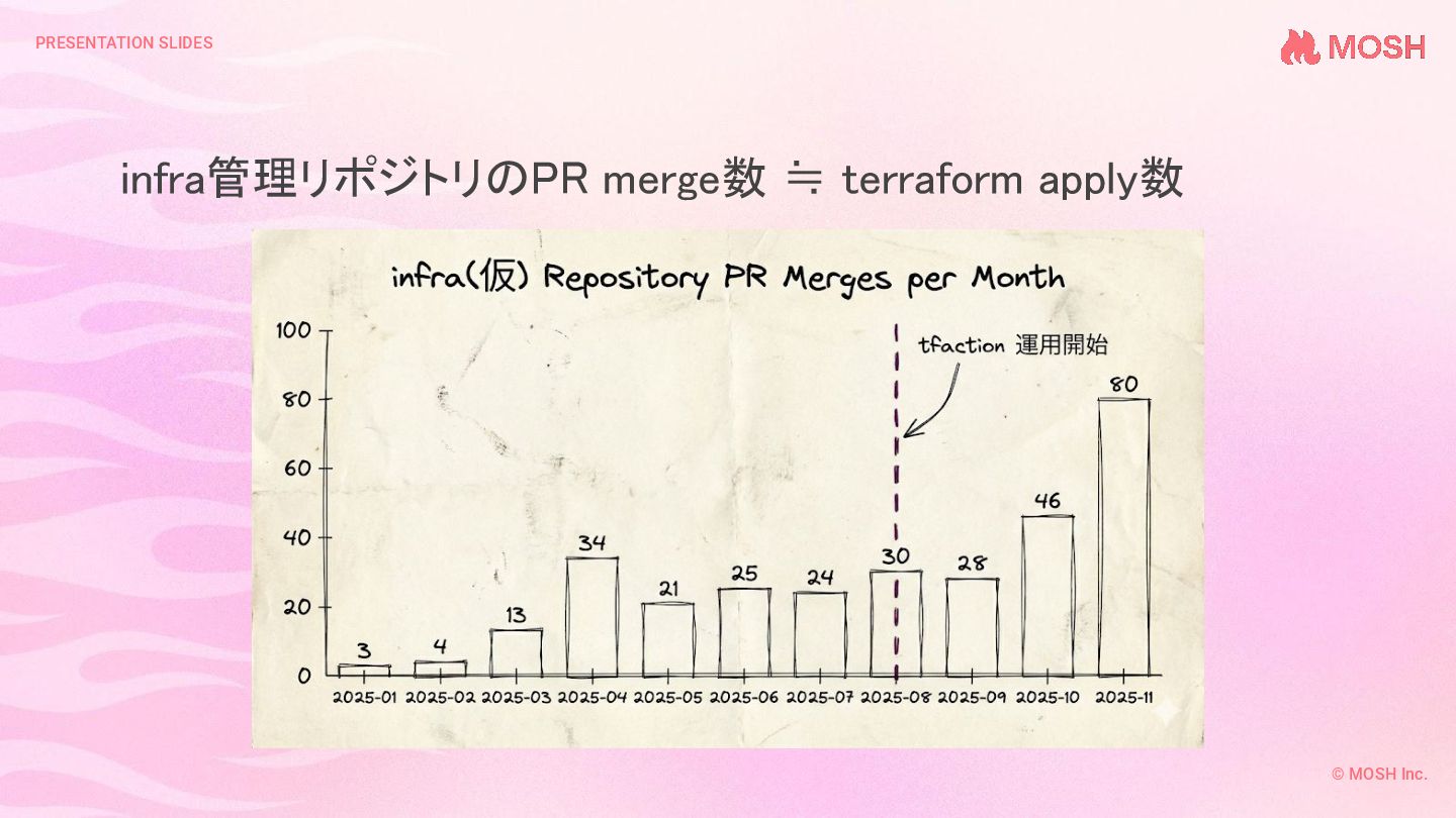 PRESENTATION SLIDES © MOSH Inc. infra管理リポジトリのPR merge数 ≒ terraform apply数