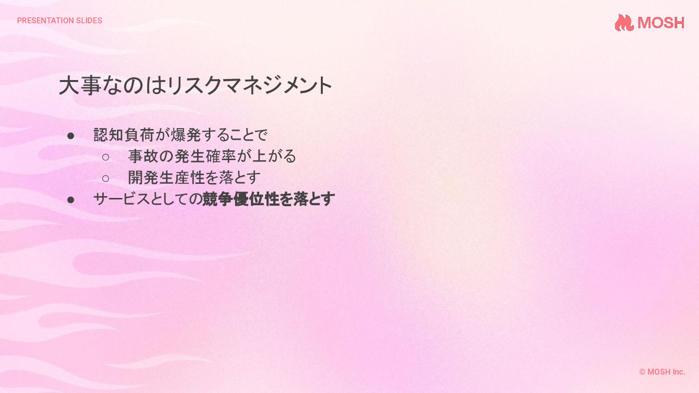 PRESENTATION SLIDES © MOSH Inc. 大事なのはリスクマネジメント • 認知負荷が爆発することで ◦ 事故の発生確率が上がる
