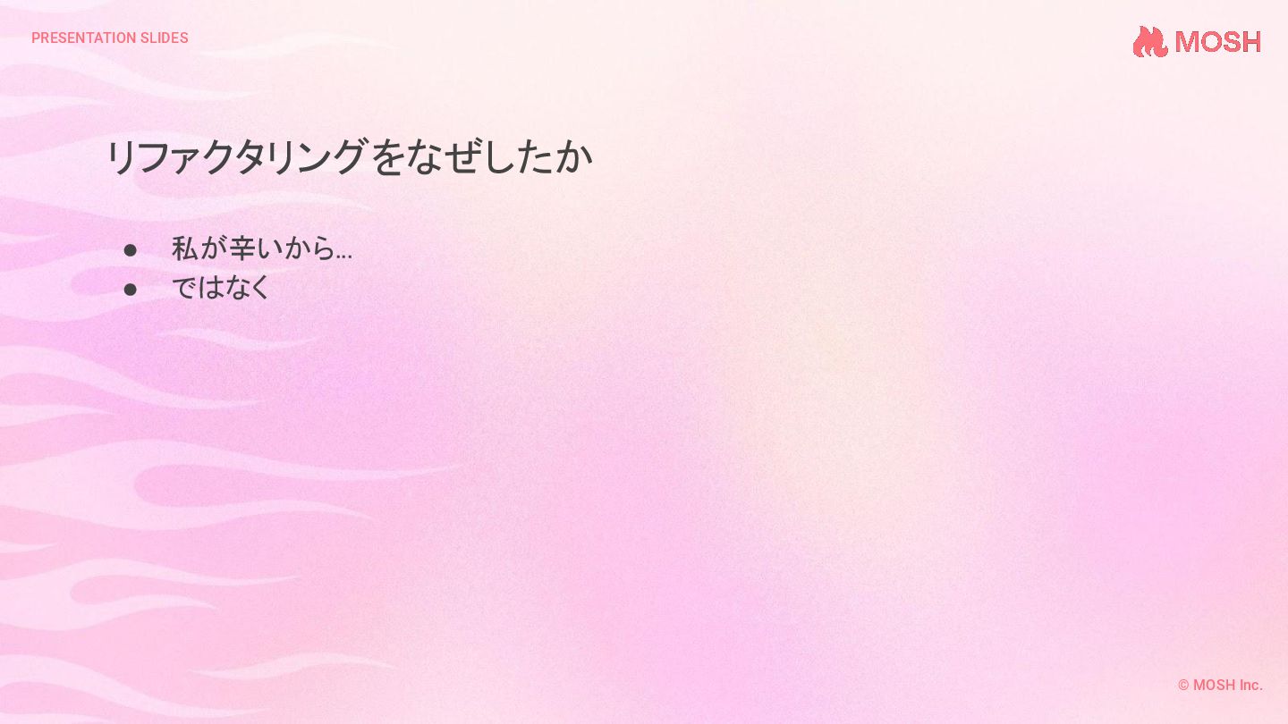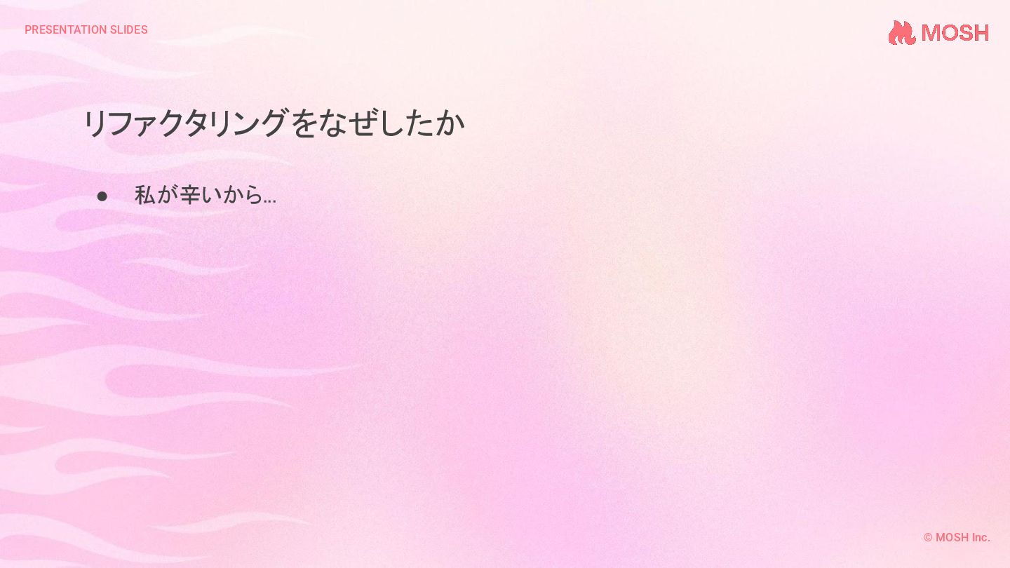 PRESENTATION SLIDES © MOSH Inc. リファクタリングをなぜしたか • 私が辛いから... • ではなく
