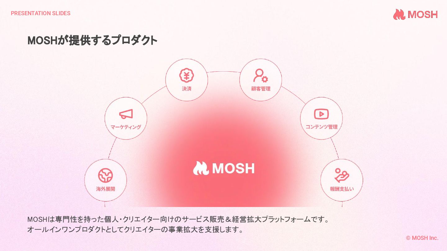 オールインワンプロダクトとしてクリエイターの事業拡大を支援します。 PRESENTATION SLIDES © MOSH Inc.