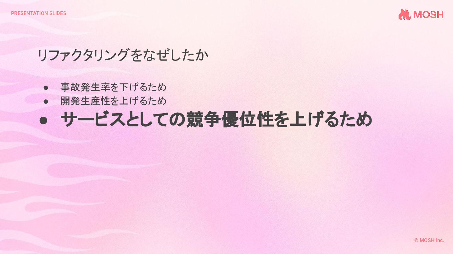 PRESENTATION SLIDES © MOSH Inc. リファクタリングをなぜしたか • 事故発生率を下げるため • 開発生産性を上げるため