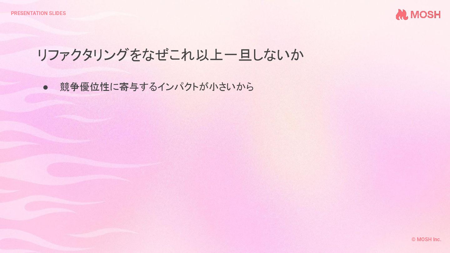PRESENTATION SLIDES © MOSH Inc. リファクタリングをなぜこれ以上一旦しないか • 競争優位性に寄与するインパクトが小さいから