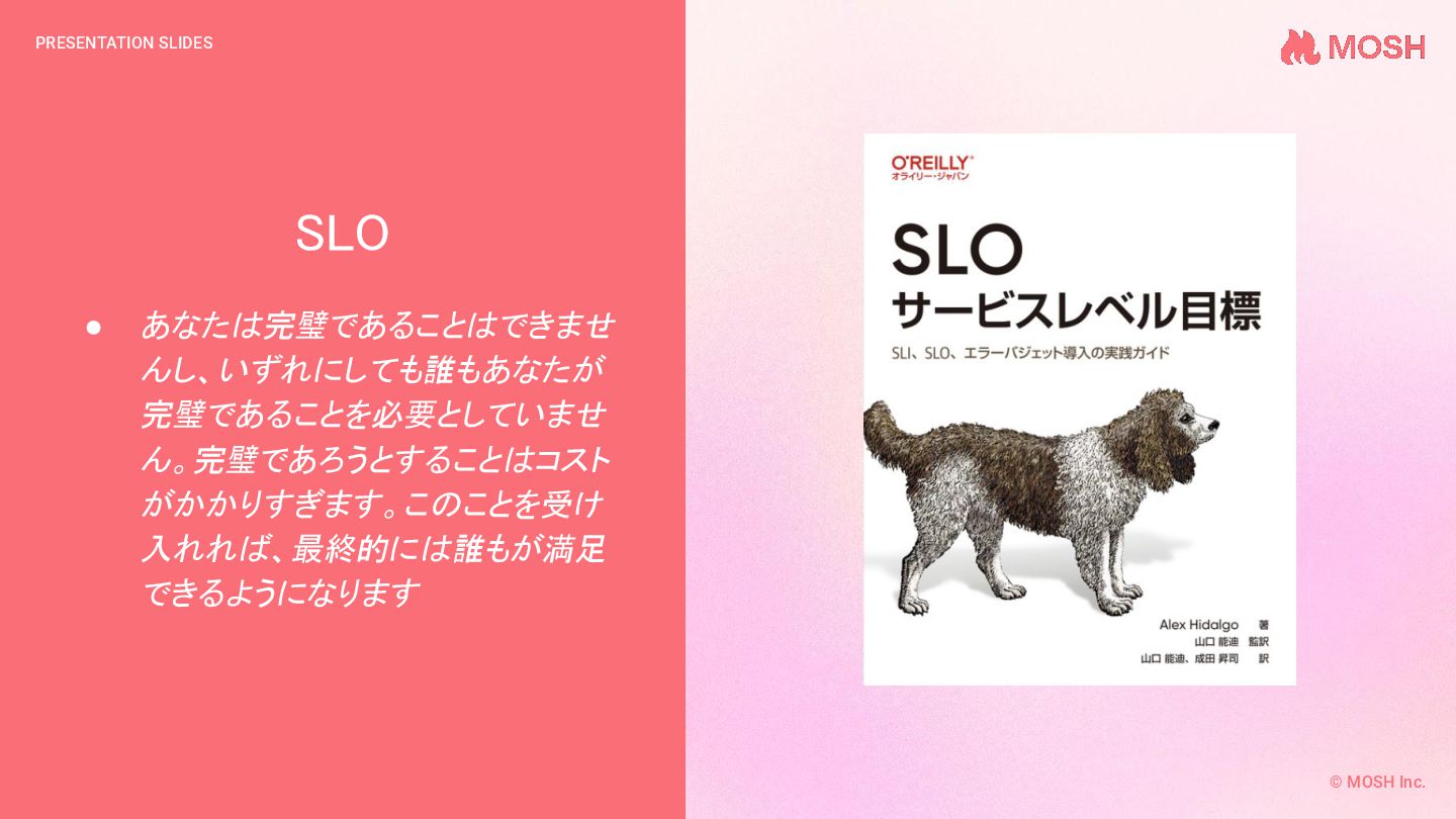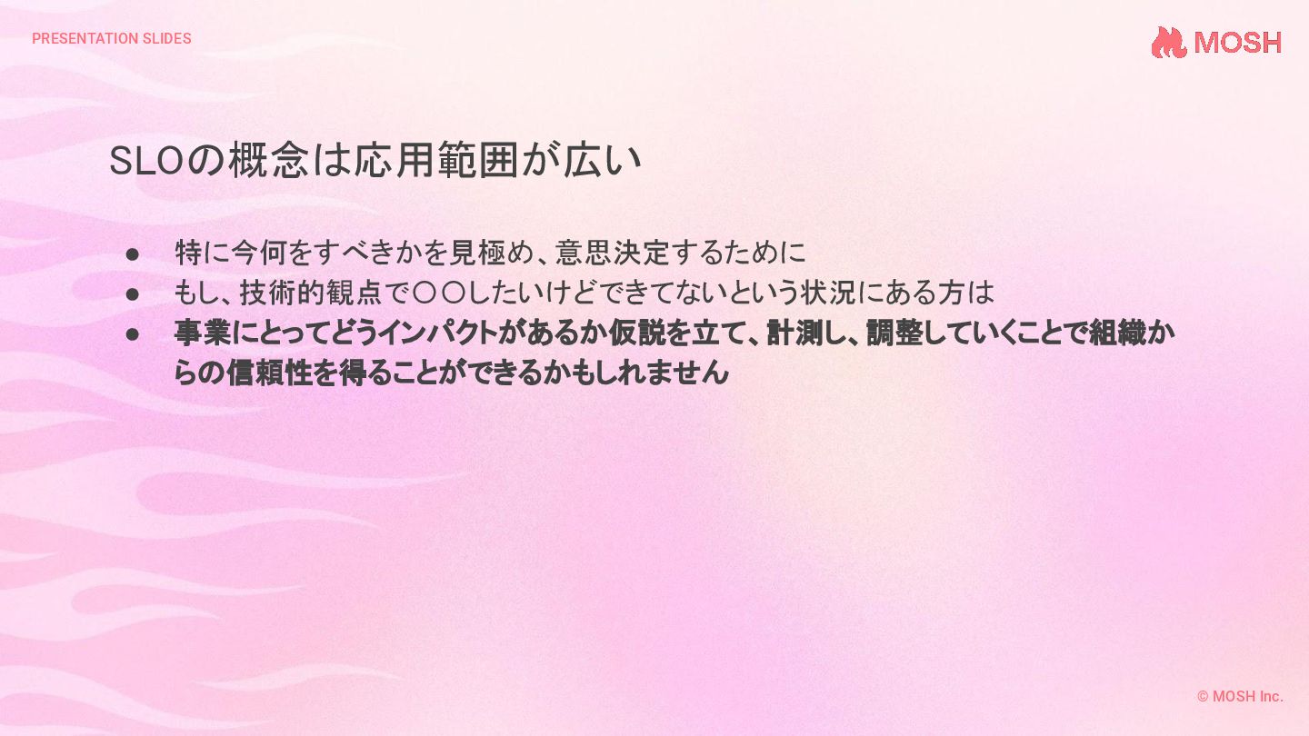 PRESENTATION SLIDES © MOSH Inc. SLOの概念は応用範囲が広い • 特に今何をすべきかを見極め、意思決定するために •