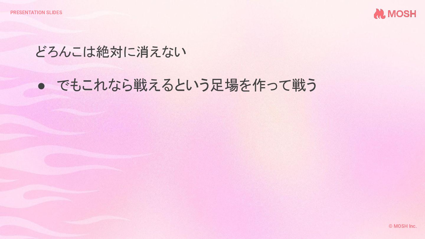 PRESENTATION SLIDES © MOSH Inc. どろんこは絶対に消えない • でもこれなら戦えるという足場を作って戦う