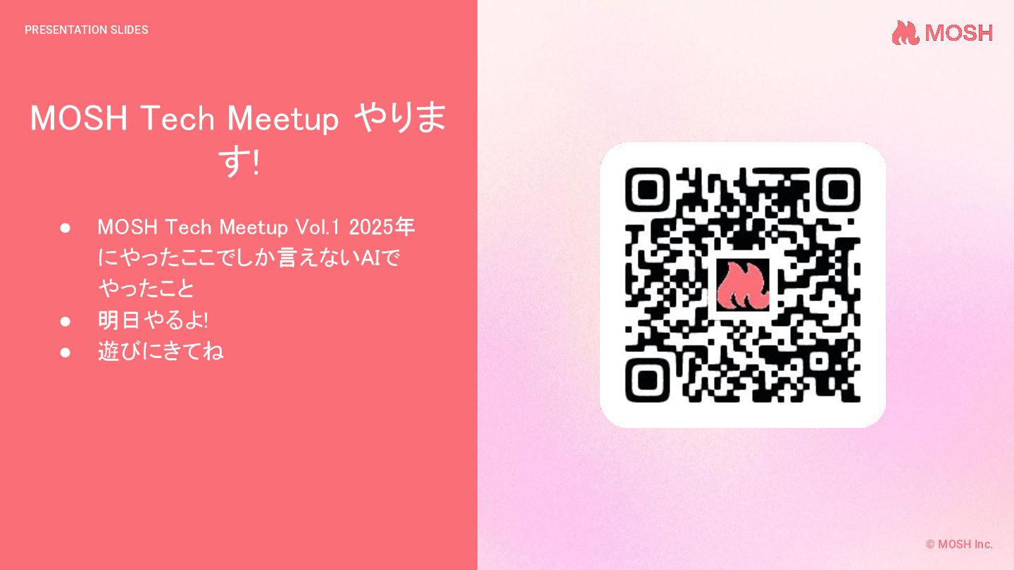 PRESENTATION SLIDES © MOSH Inc. MOSH Tech Meetup やりま す!
