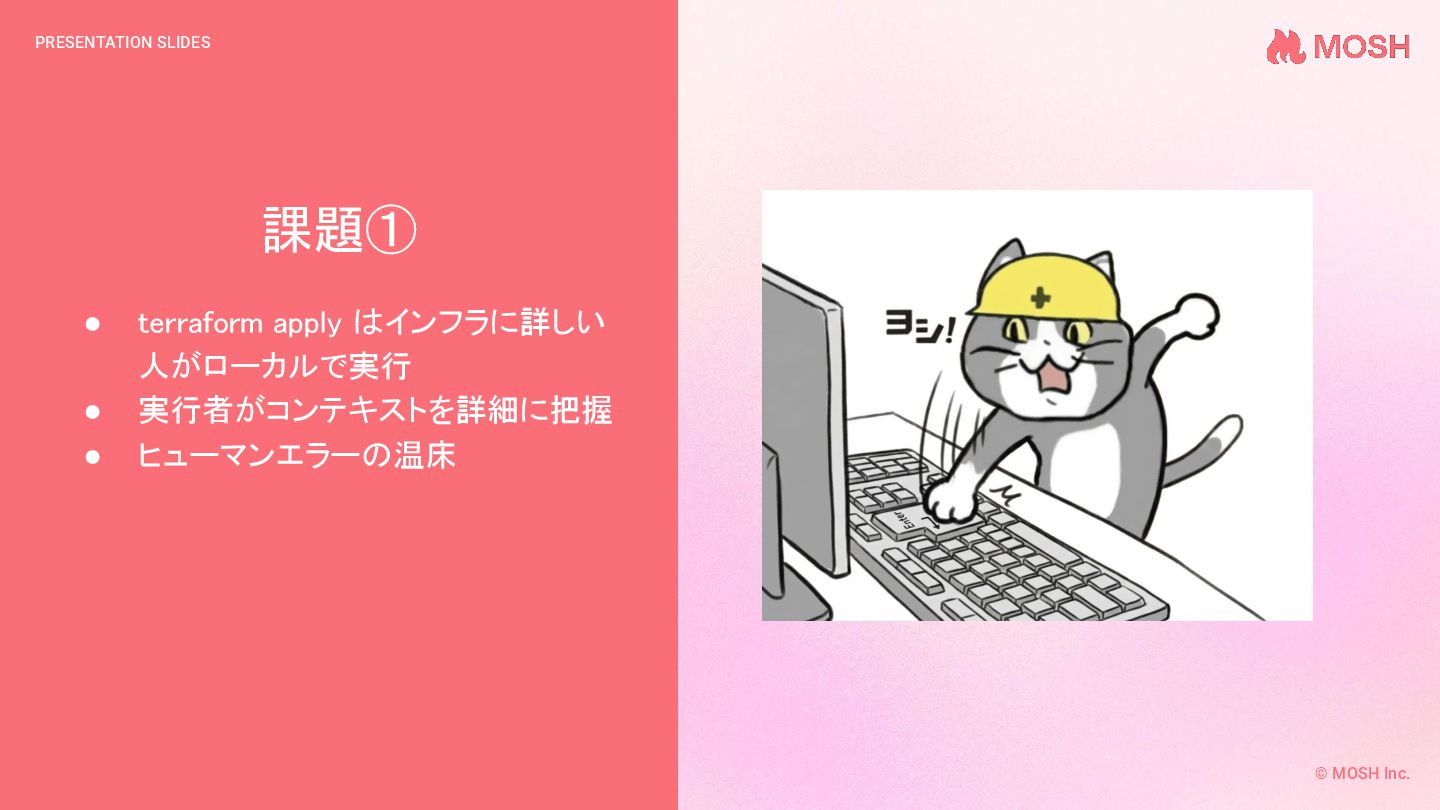 PRESENTATION SLIDES © MOSH Inc. 課題 • terraform apply はインフラに詳しい人がローカルで実行