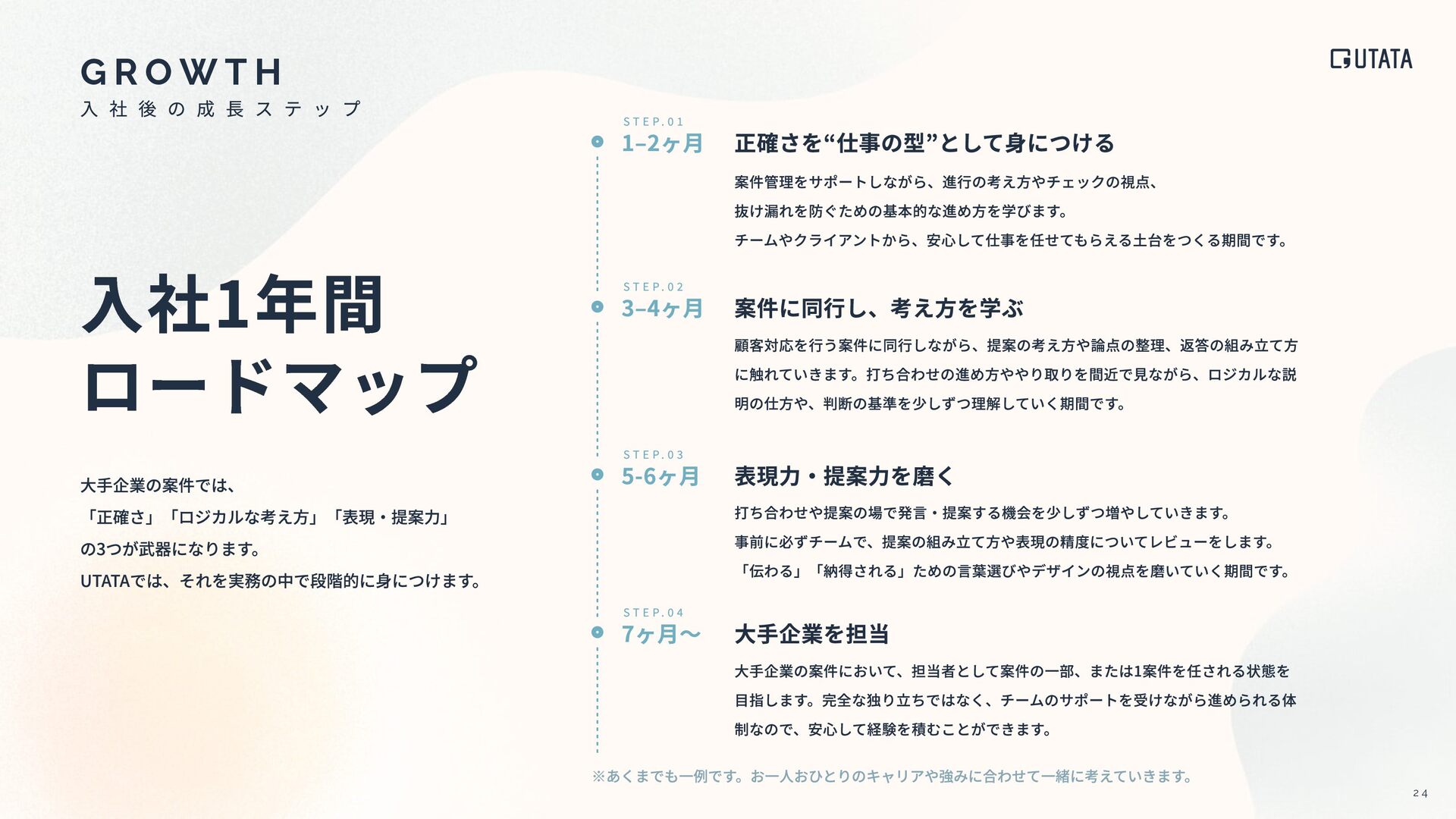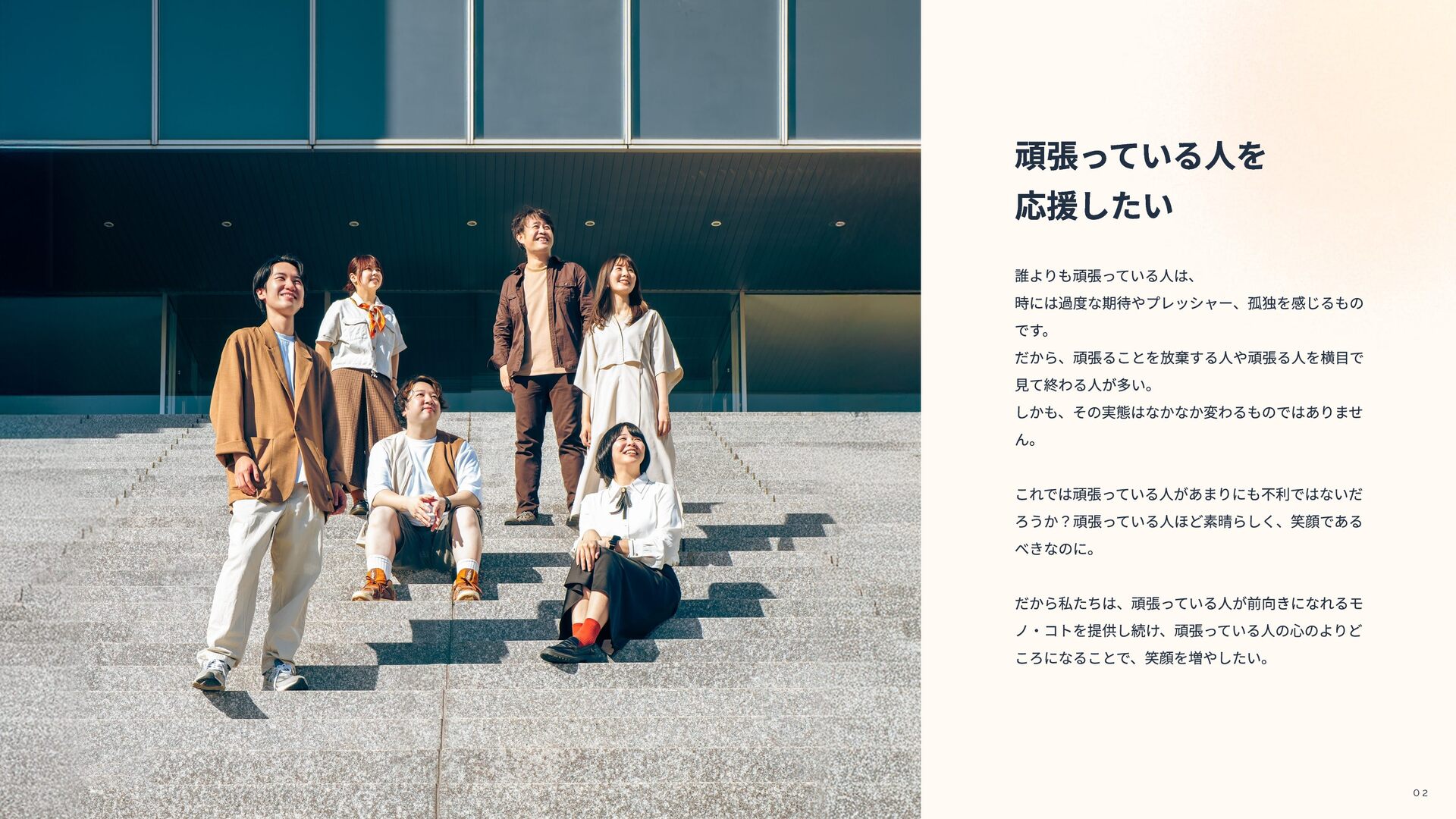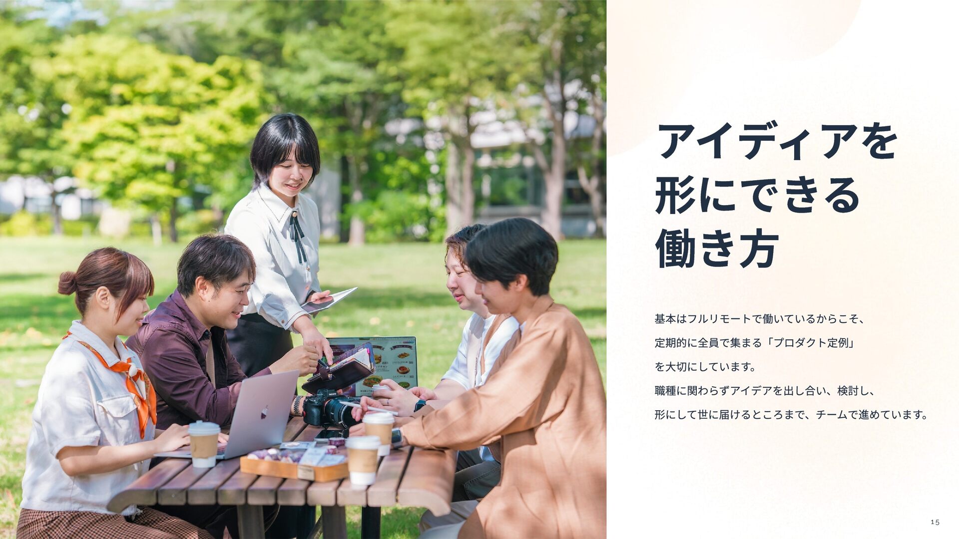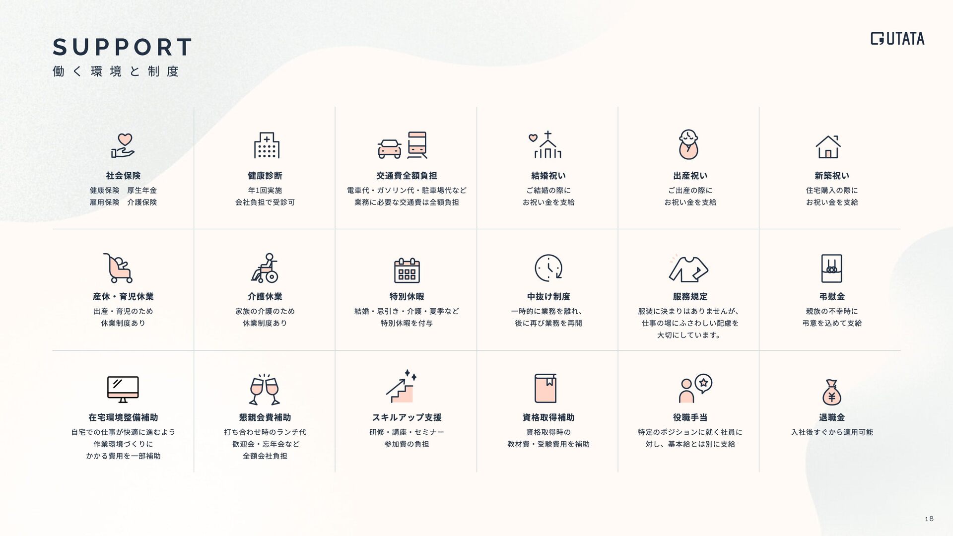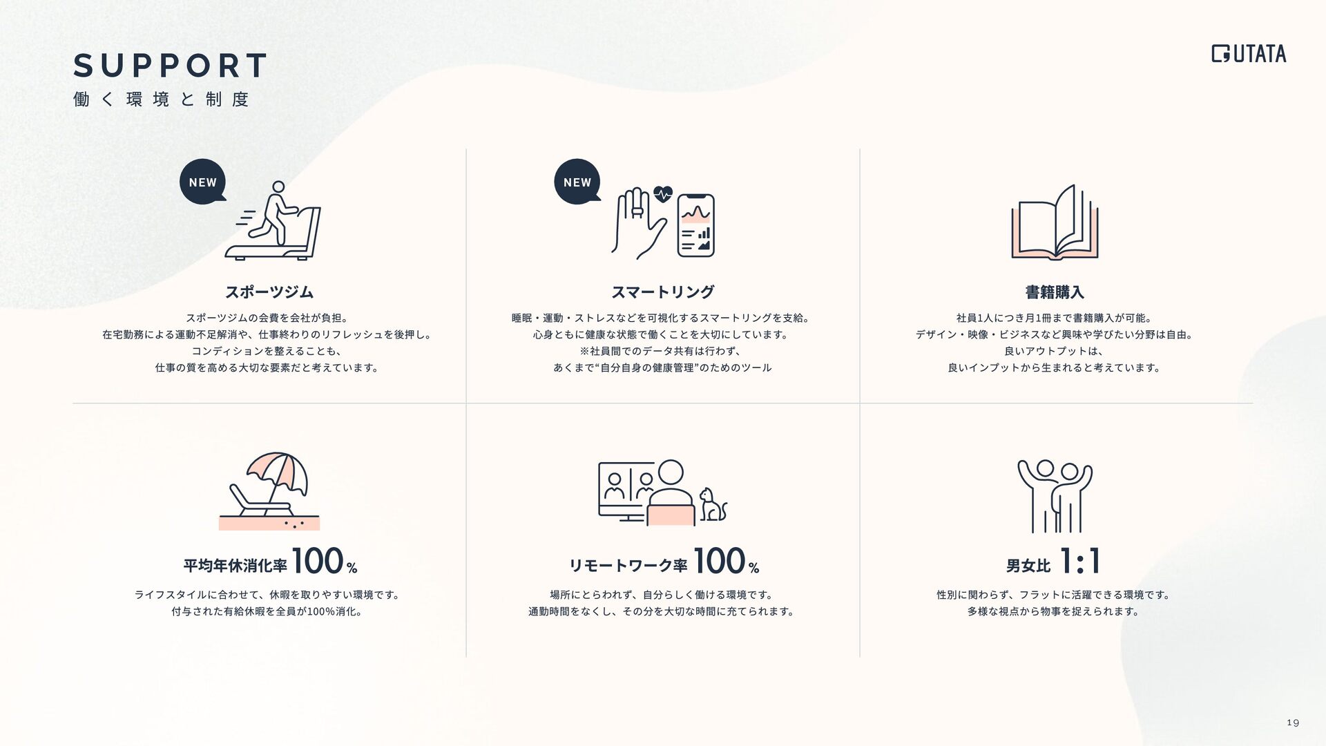 U P P O R T スポーツジム スマートリング 書籍購⼊ スポーツジムの会費を会社が負担。 在宅勤務による運動不⾜解消や、仕事終わりのリフレッシュを後押し。 コンディションを整えることも、 仕事の質を⾼める⼤切な要素だと考えています。 ライフスタイルに合わせて、休暇を取りやすい環境です。 付与された有給休暇を全員が100%消化。 場所にとらわれず、⾃分らしく働ける環境です。 通勤時間をなくし、その分を⼤切な時間に充てられます。 性別に関わらず、フラットに活躍できる環境です。 多様な視点から物事を捉えられます。 睡眠‧運動‧ストレスなどを可視化するスマートリングを⽀給。 ⼼⾝ともに健康な状態で働くことを⼤切にしています。 ※社員間でのデータ共有は⾏わず、 あくまで“⾃分⾃⾝の健康管理”のためのツール 社員1⼈につき⽉1冊まで書籍購⼊が可能。 デザイン‧映像‧ビジネスなど興味や学びたい分野は⾃由。 良いアウトプットは、 良いインプットから⽣まれると考えています。 男⼥⽐ 1:1 平均年休消化率100% NEW NEW リモートワーク率100%