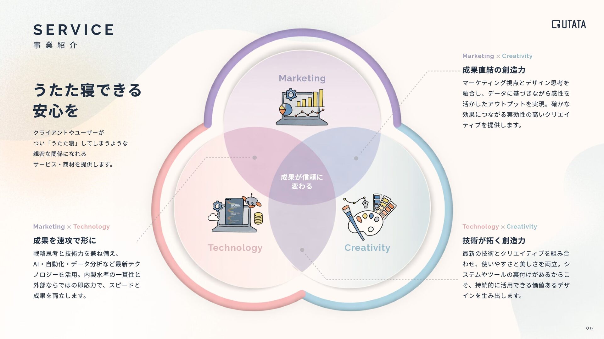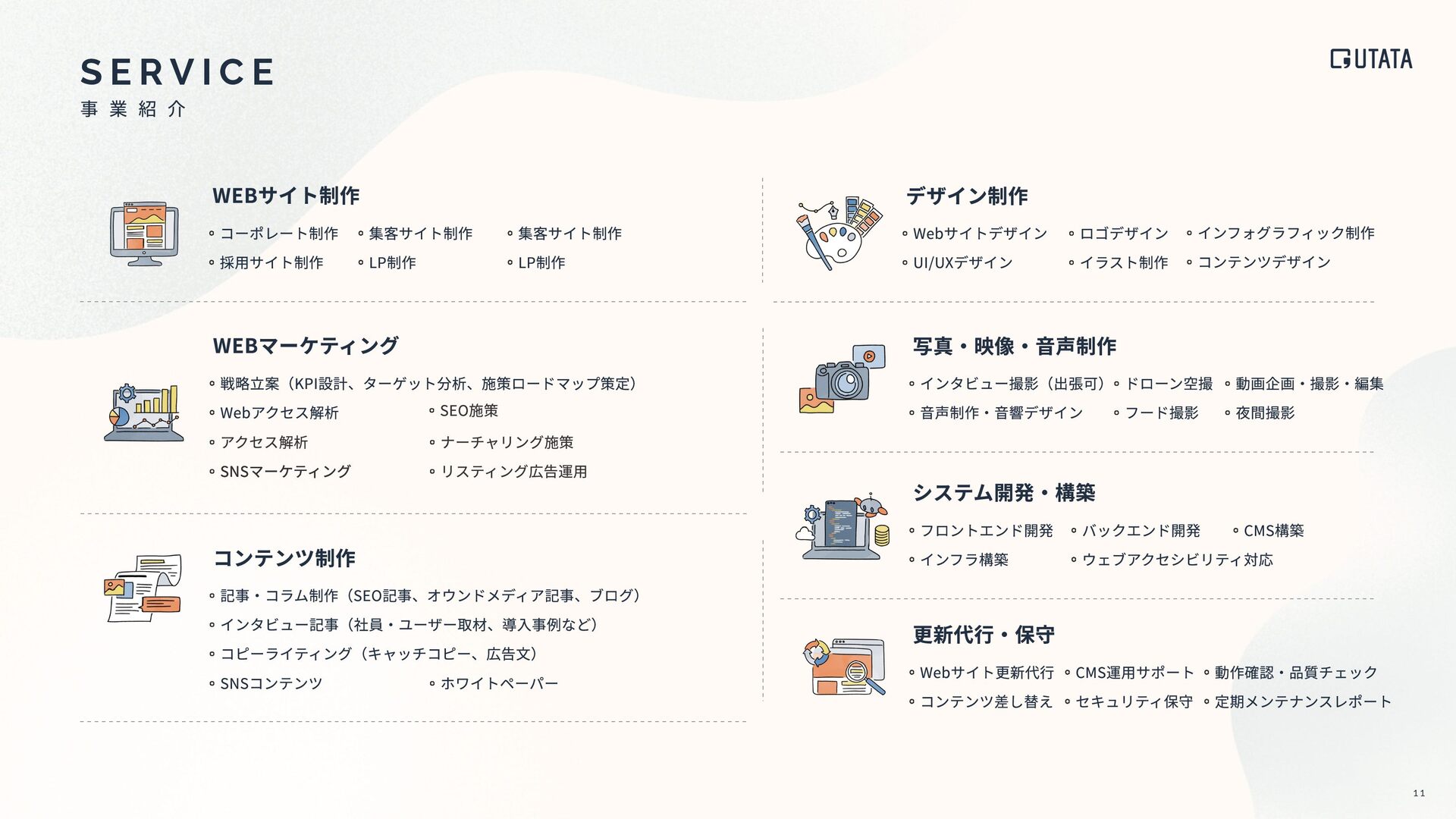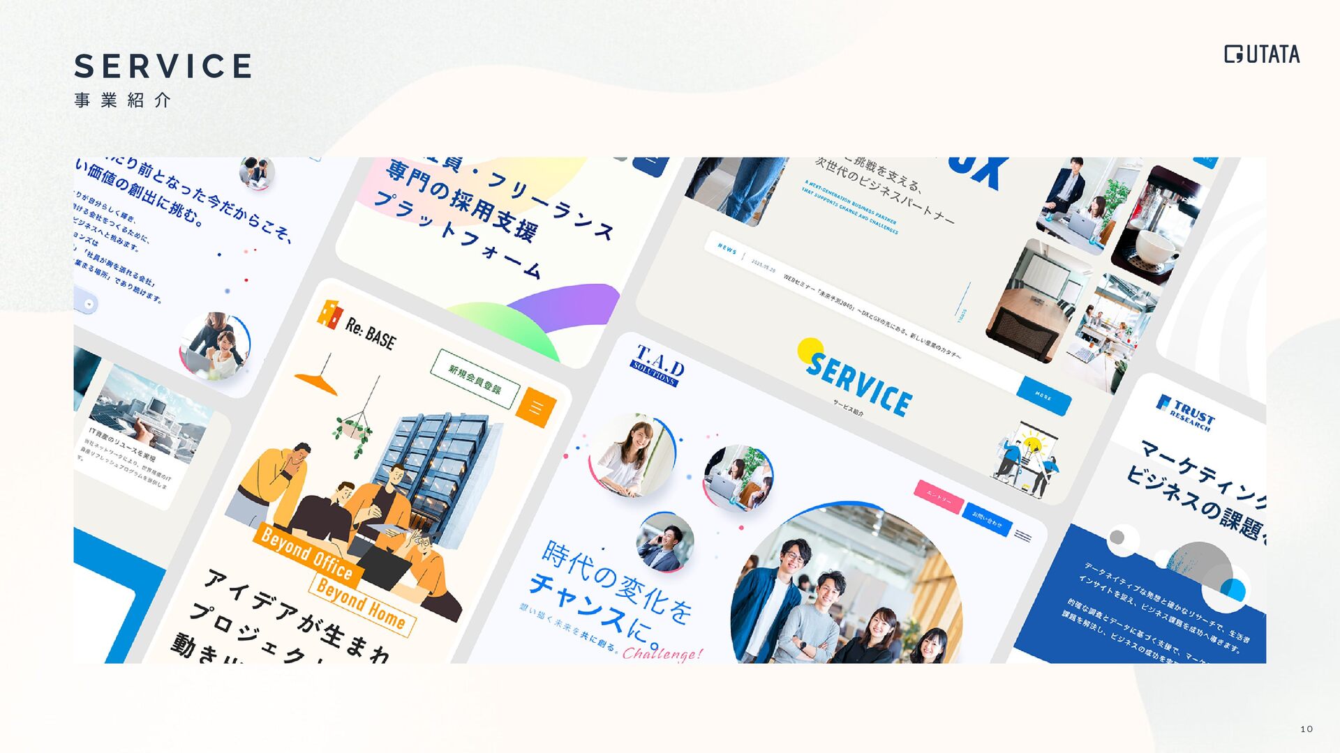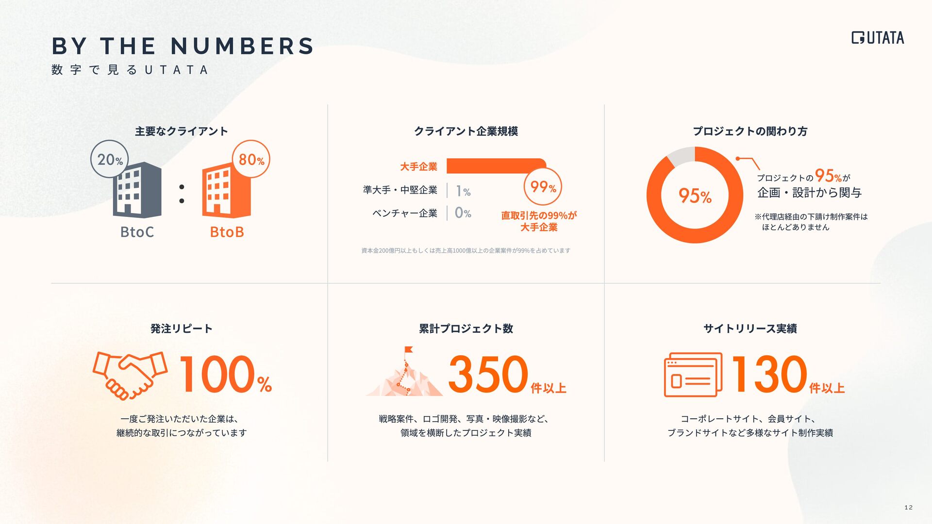 B Y T H E N U M B E R S 95% ⼀度ご発注いただいた企業は、 継続的な取引につながっています 戦略案件、ロゴ開発、写真‧映像撮影など、 領域を横断したプロジェクト実績 コーポレートサイト、会員サイト、 ブランドサイトなど多様なサイト制作実績 プロジェクトの が 企画‧設計から関与 ※代理店経由の下請け制作案件は ほとんどありません ⼤⼿企業 準⼤⼿‧中堅企業 ベンチャー企業 直取引先の99%が ⼤⼿企業 資本⾦200億円以上もしくは売上⾼1000億以上の企業案件が99%を占めています 件以上 件以上 350 130 主要なクライアント 発注リピート 累計プロジェクト数 サイトリリース実績 クライアント企業規模 プロジェクトの関わり⽅ 99% 20% 80% BtoC BtoB 1% 0% 95% 100% 1 2