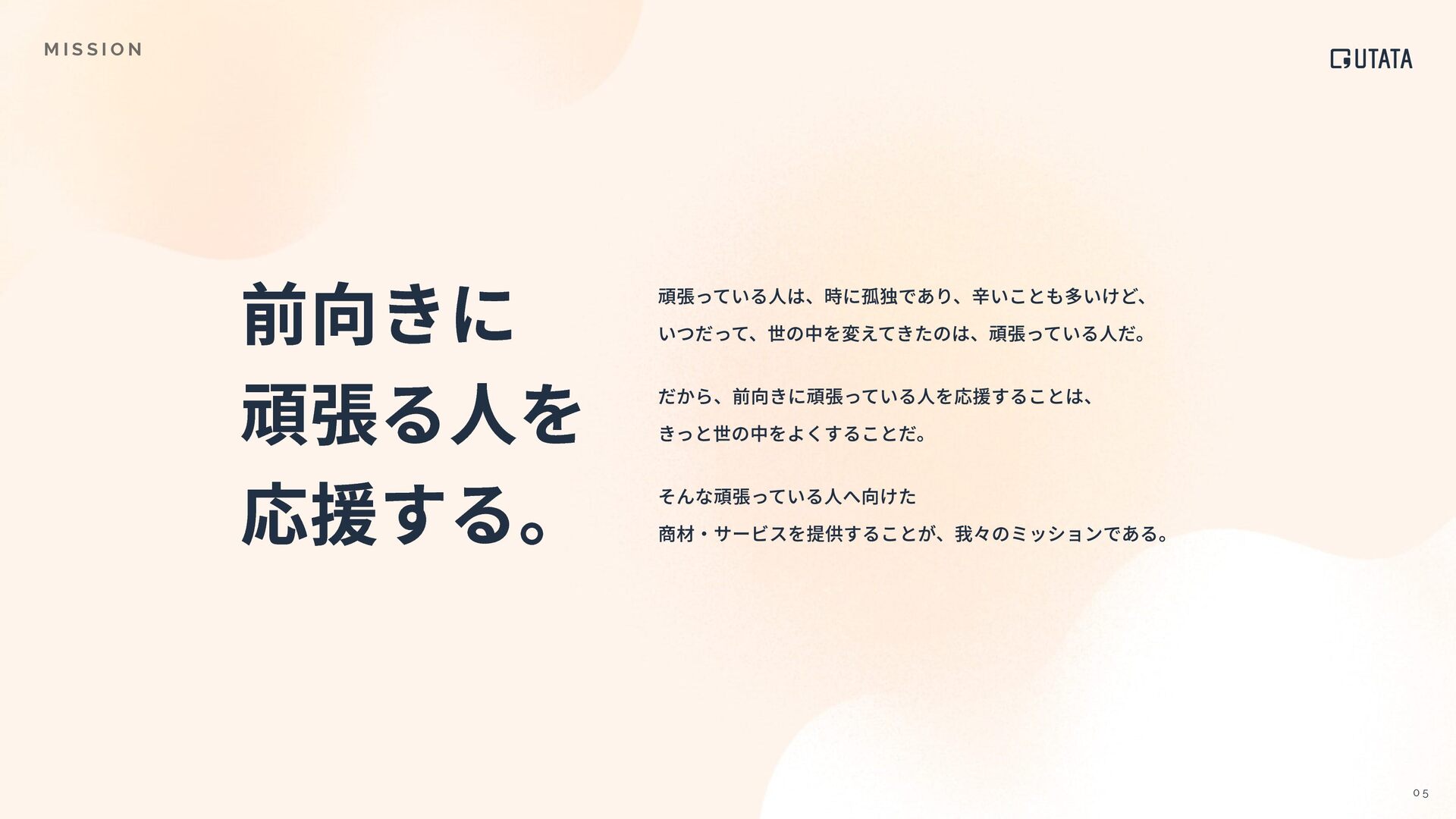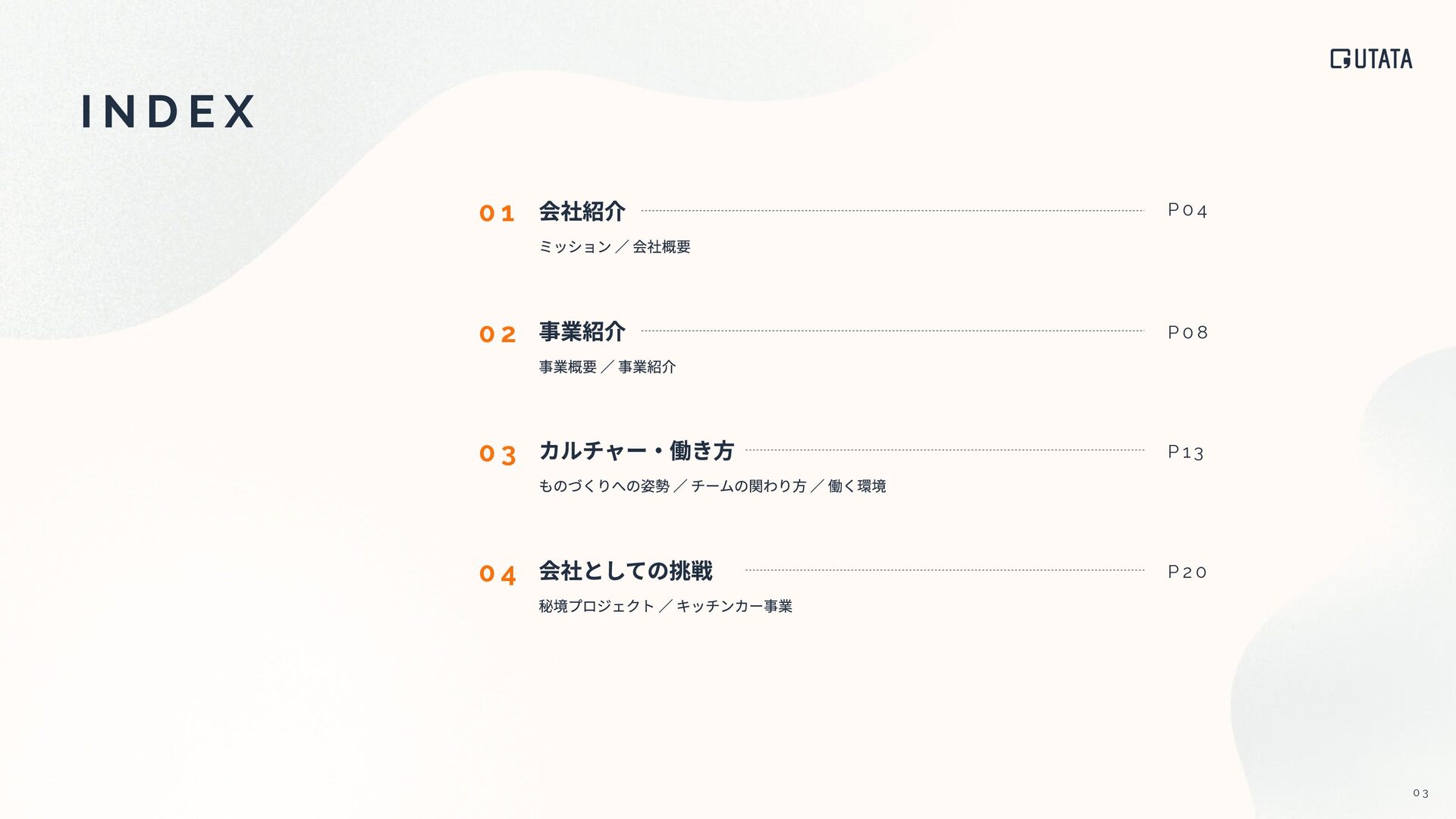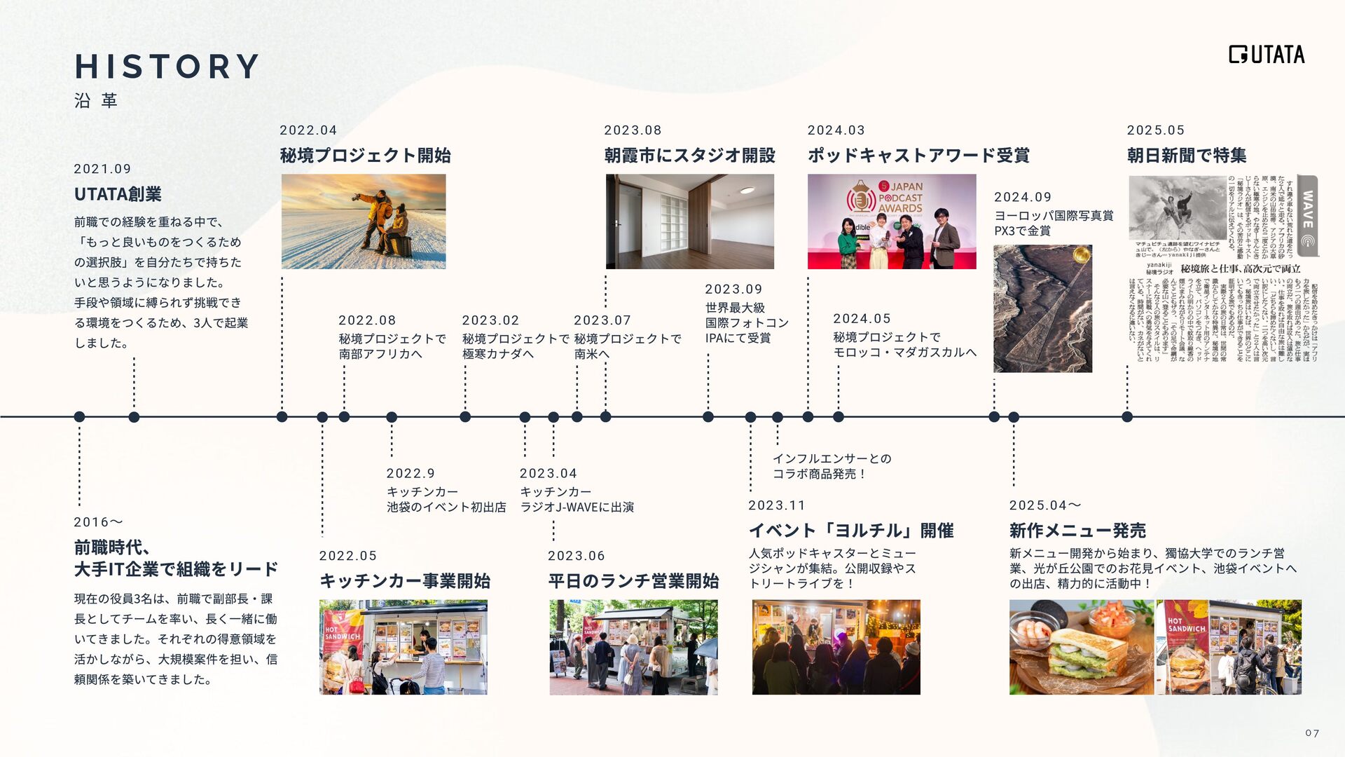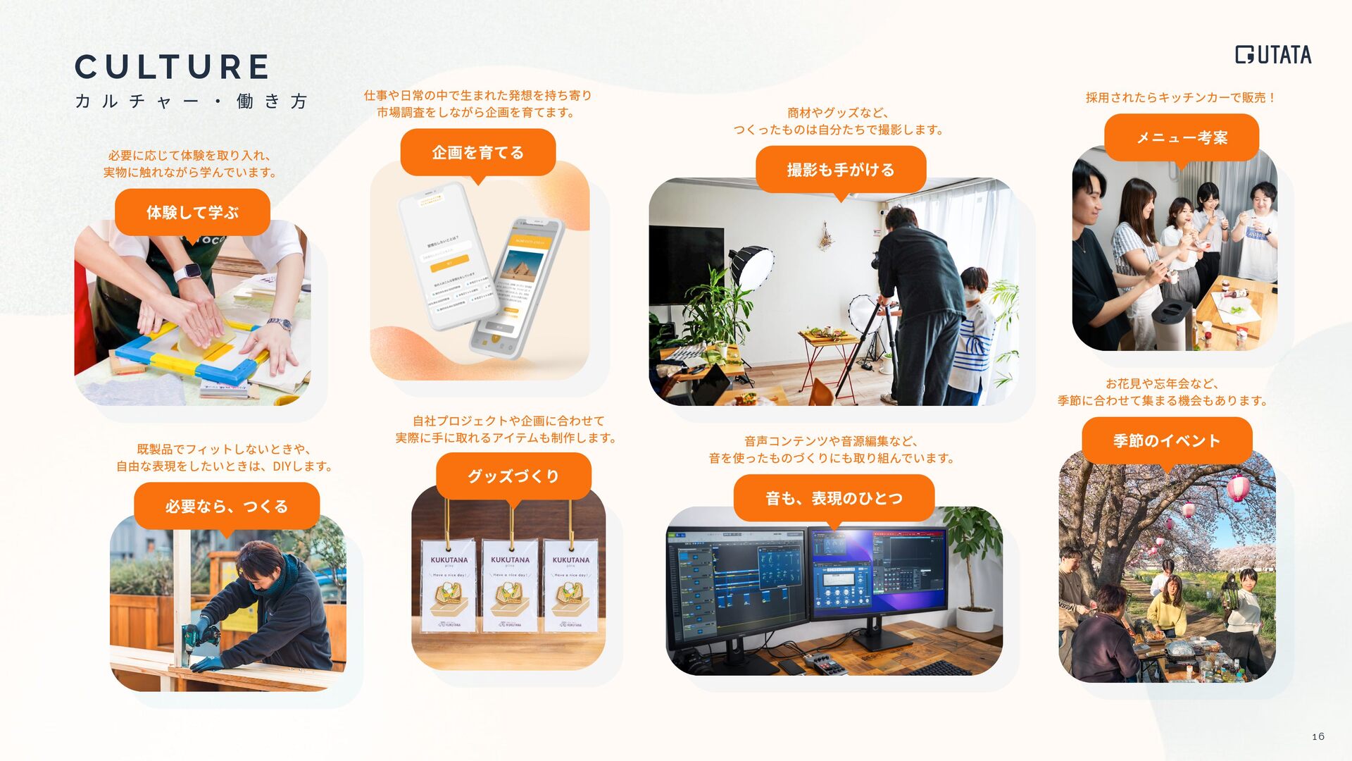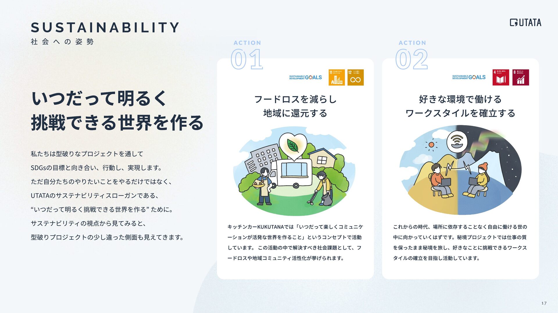 I N A B I L I T Y いつだって明るく 挑戦できる世界を作る 私たちは型破りなプロジェクトを通して SDGsの⽬標と向き合い、⾏動し、実現します。 ただ⾃分たちのやりたいことをやるだけではなく、 UTATAのサステナビリティスローガンである、 “いつだって明るく挑戦できる世界を作る” ために。 サステナビリティの視点から⾒てみると、 型破りプロジェクトの少し違った側⾯も⾒えてきます。 キッチンカーKUKUTANAでは「いつだって楽しくコミュニケ ーションが活発な世界を作ること」というコンセプトで活動 しています。 この活動の中で解決すべき社会課題として、フ ードロスや地域コミュニティ活性化が挙げられます。 フードロスを減らし 地域に還元する これからの時代、場所に依存することなく⾃由に働ける世の 中に向かっていくはずです。秘境プロジェクトでは仕事の質 を保ったまま秘境を旅し、好きなことに挑戦できるワークス タイルの確⽴を⽬指し活動しています。 好きな環境で働ける ワークスタイルを確⽴する 1 7