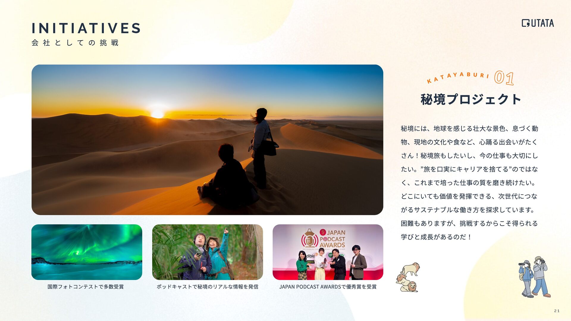 I T I AT I V E S 秘境プロジェクト 秘境には、地球を感じる壮⼤な景⾊、息づく動 物、現地の⽂化や⾷など、⼼踊る出会いがたく さん!秘境旅もしたいし、今の仕事も⼤切にし たい。”旅を⼝実にキャリアを捨てる”のではな く、これまで培った仕事の質を磨き続けたい。 どこにいても価値を発揮できる、次世代につな がるサステナブルな働き⽅を探求しています。 困難もありますが、挑戦するからこそ得られる 学びと成⻑があるのだ! 2 1 国際フォトコンテストで多数受賞 ポッドキャストで秘境のリアルな情報を発信 JAPAN PODCAST AWARDSで優秀賞を受賞