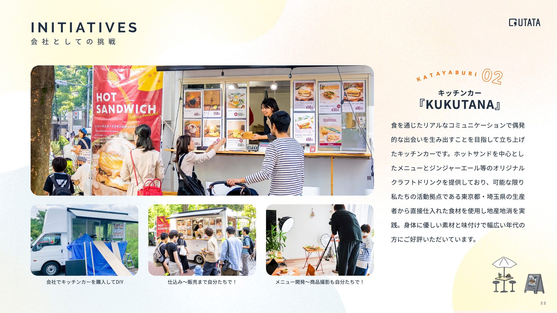 I T I AT I V E S キッチンカー 『KUKUTANA』 ⾷を通じたリアルなコミュニケーションで偶発 的な出会いを⽣み出すことを⽬指して⽴ち上げ たキッチンカーです。ホットサンドを中⼼とし たメニューとジンジャーエール等のオリジナル クラフトドリンクを提供しており、可能な限り 私たちの活動拠点である東京都‧埼⽟県の⽣産 者から直接仕⼊れた⾷材を使⽤し地産地消を実 践。⾝体に優しい素材と味付けで幅広い年代の ⽅にご好評いただいています。 会社でキッチンカーを購⼊してDIY 仕込み〜販売まで⾃分たちで! メニュー開発〜商品撮影も⾃分たちで! 2 2