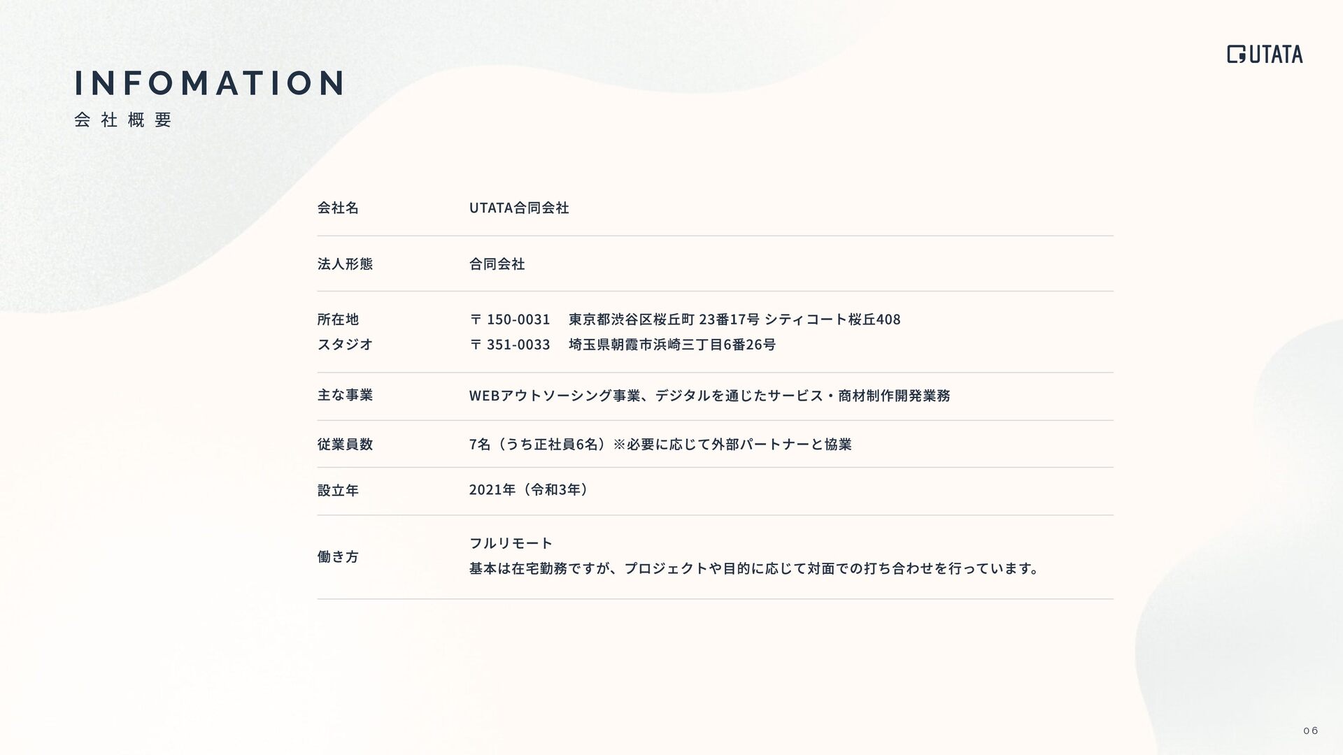 〒 150-0031 東京都渋⾕区桜丘町 23番17号 シティコート桜丘408 WEBアウトソーシング事業、デジタルを通じたサービス‧商材制作開発業務 7名(うち正社員6名)※必要に応じて外部パートナーと協業 2021年(令和3年) フルリモート 基本は在宅勤務ですが、プロジェクトや⽬的に応じて対⾯での打ち合わせを⾏っています。 〒 351-0033 埼⽟県朝霞市浜崎三丁⽬6番26号 会 社 概 要 I N F O M AT I O N 0 6