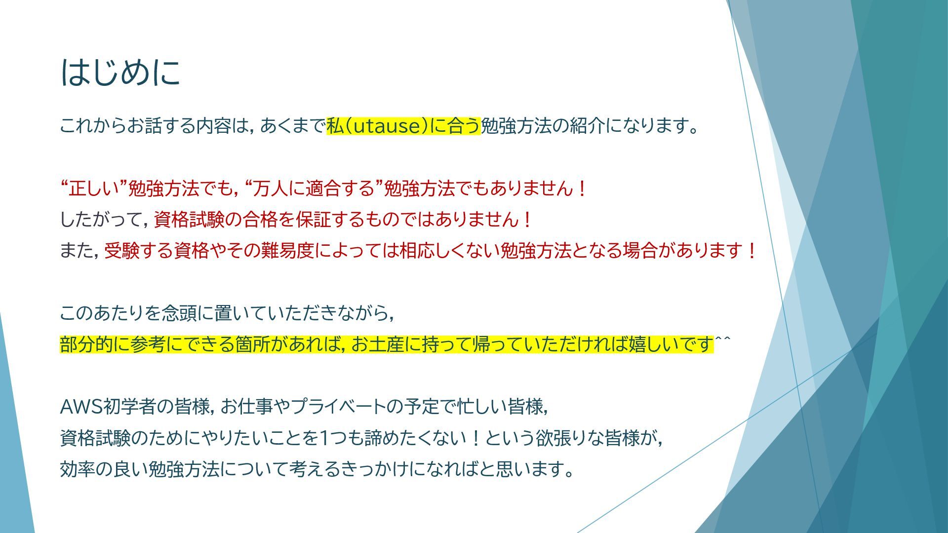 はじめに これからお話する内容は,あくまで私(utause)に合う勉強方法の紹介になります。 “正しい”勉強方法でも,“万人に適合する”勉強方法でもありません! したがって,資格試験の合格を保証するものではありません! また,受験する資格やその難易度によっては相応しくない勉強方法となる場合があります! このあたりを念頭に置いていただきながら, 部分的に参考にできる箇所があれば,お土産に持って帰っていただければ嬉しいです^^ AWS初学者の皆様,お仕事やプライベートの予定で忙しい皆様, 資格試験のためにやりたいことを1つも諦めたくない!という欲張りな皆様が, 効率の良い勉強方法について考えるきっかけになればと思います。