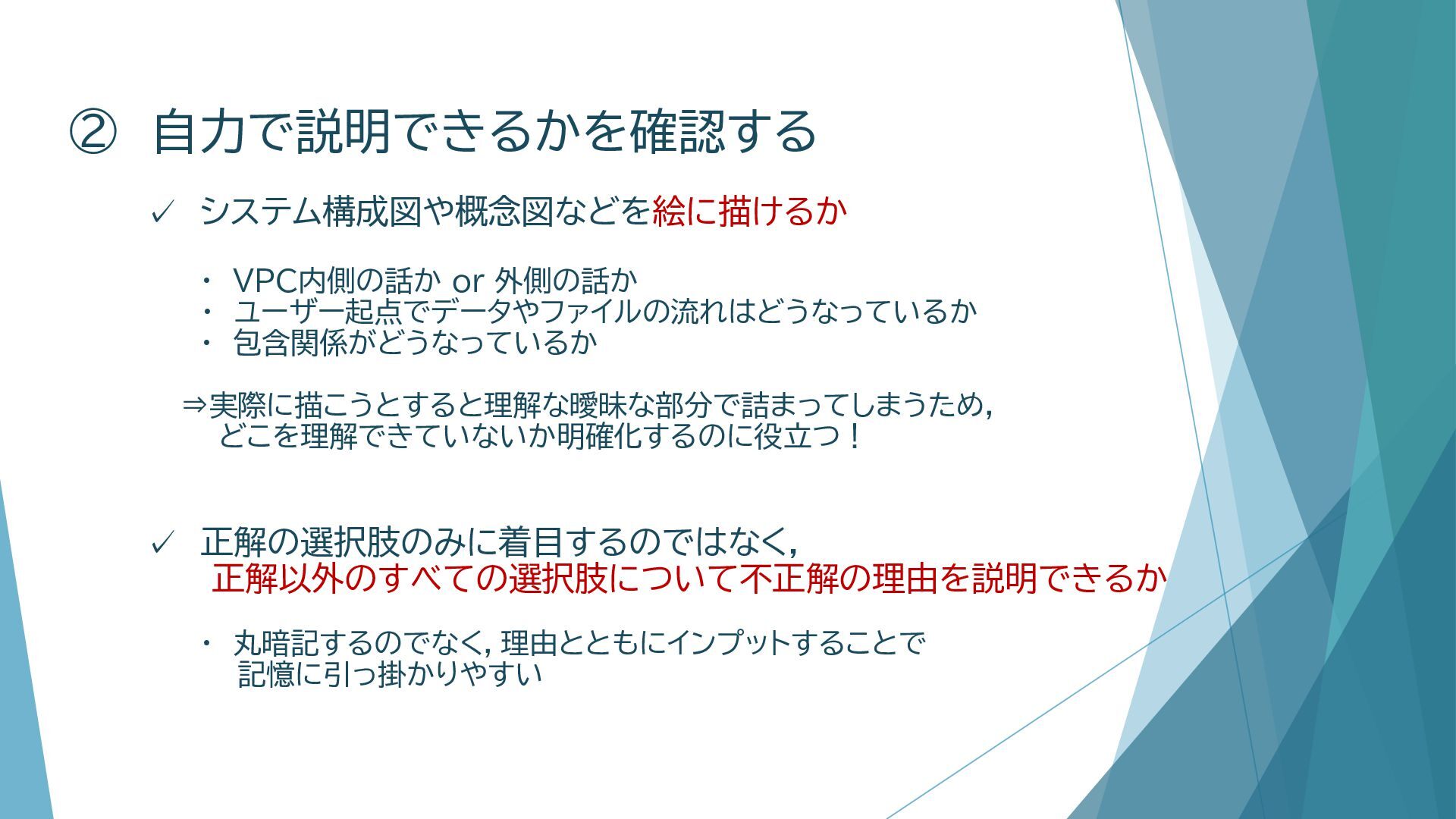 / 不正解の理由を説明できるか≒正解の選択肢だけを見ない) ③ 自分の解釈が正しいかを第三者に確認してもらう (人でもAIでもOK)